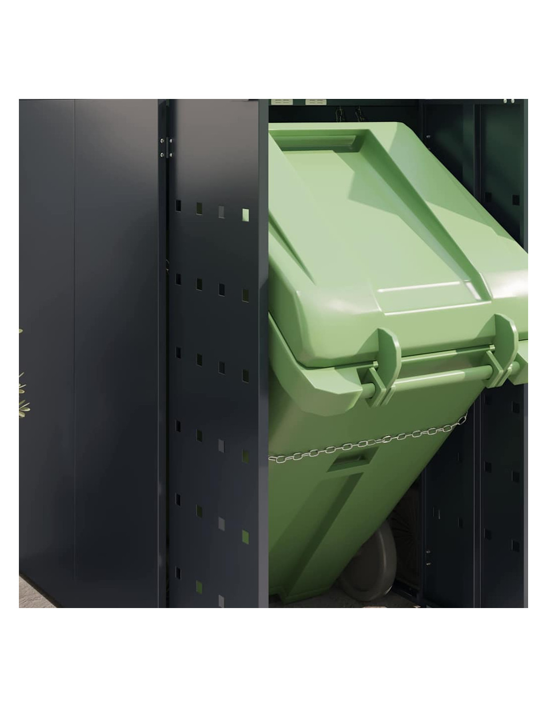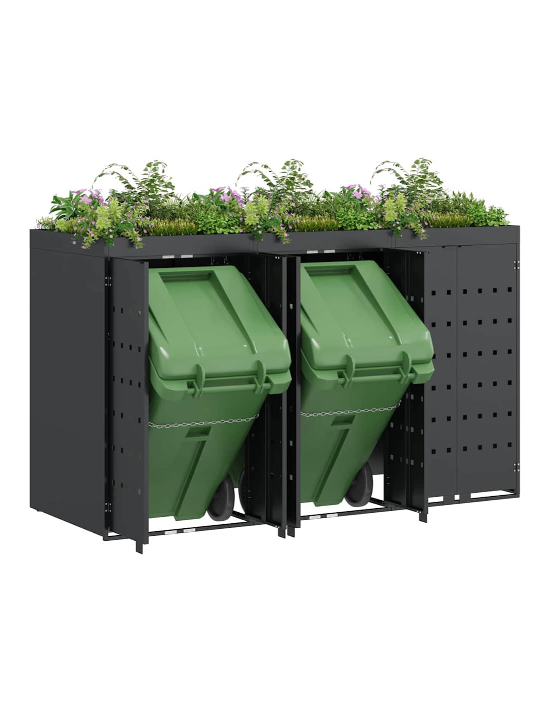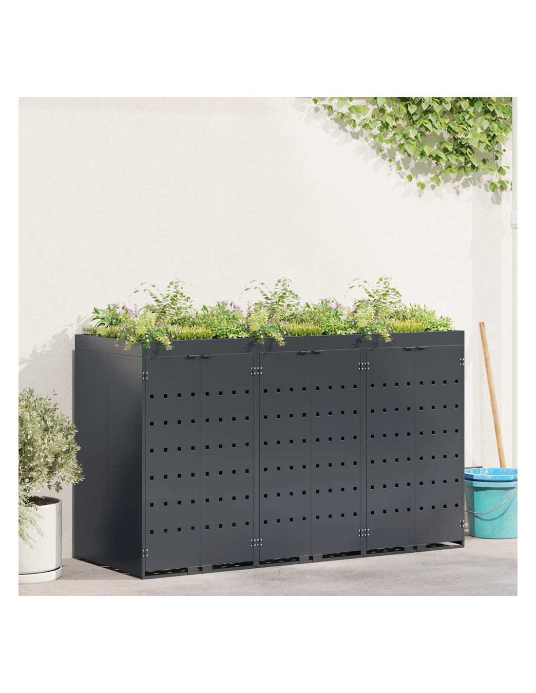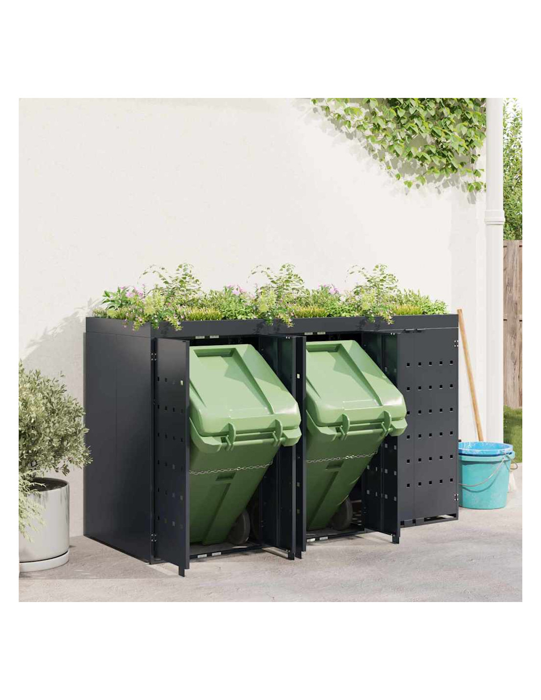 Questo contenitore per rifiuti con tetto da giardino è una soluzione chic per mantenere in ordine l'area esterna. È progettato per adattarsi bene a giardini e terrazze. Con il suo design minimale e linee pulite, si integra facilmente in ogni ambiente moderno. Nasconde i bidoni in modo elegante e permette di coltivare piante o erbe, portando un po'di natura nel tuo spazio.
