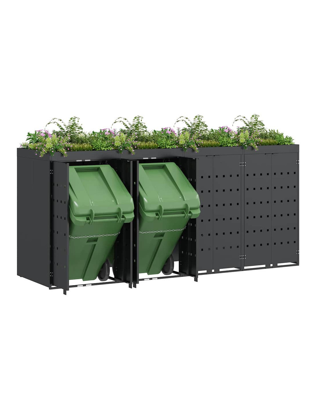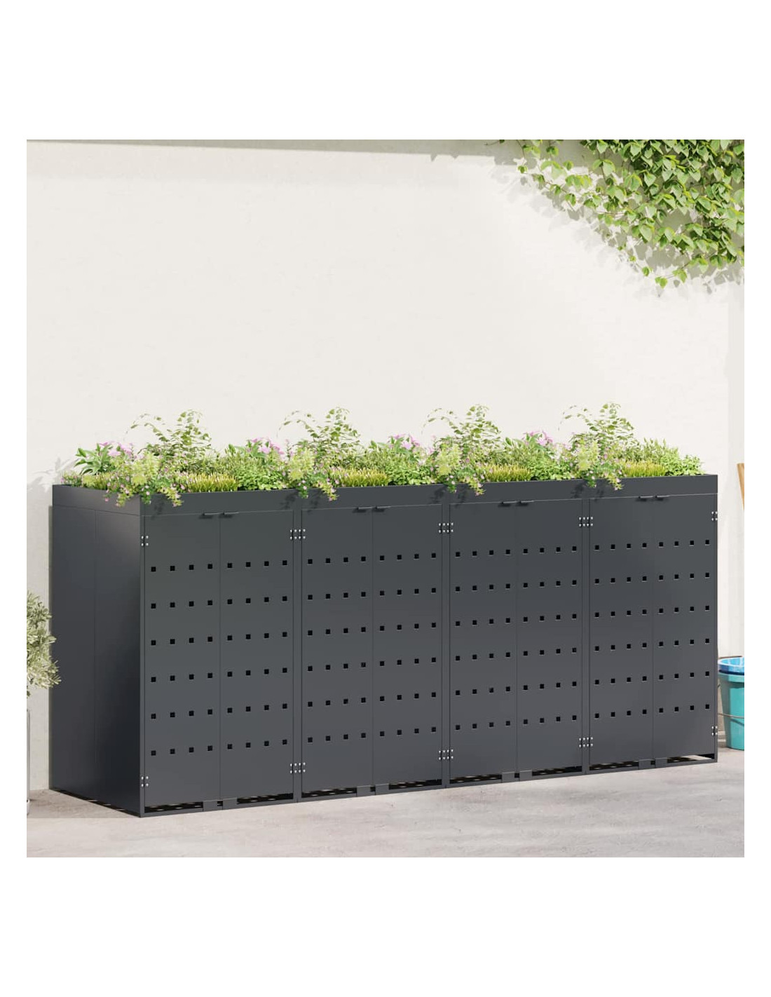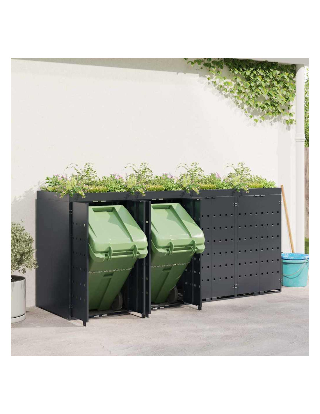Questo contenitore per rifiuti con tetto da giardino è una soluzione chic per mantenere in ordine l'area esterna. È progettato per adattarsi bene a giardini e terrazze. Con il suo design minimale e linee pulite, si integra facilmente in ogni ambiente moderno. Nasconde i bidoni in modo elegante e permette di coltivare piante o erbe, portando un po'di natura nel tuo spazio.