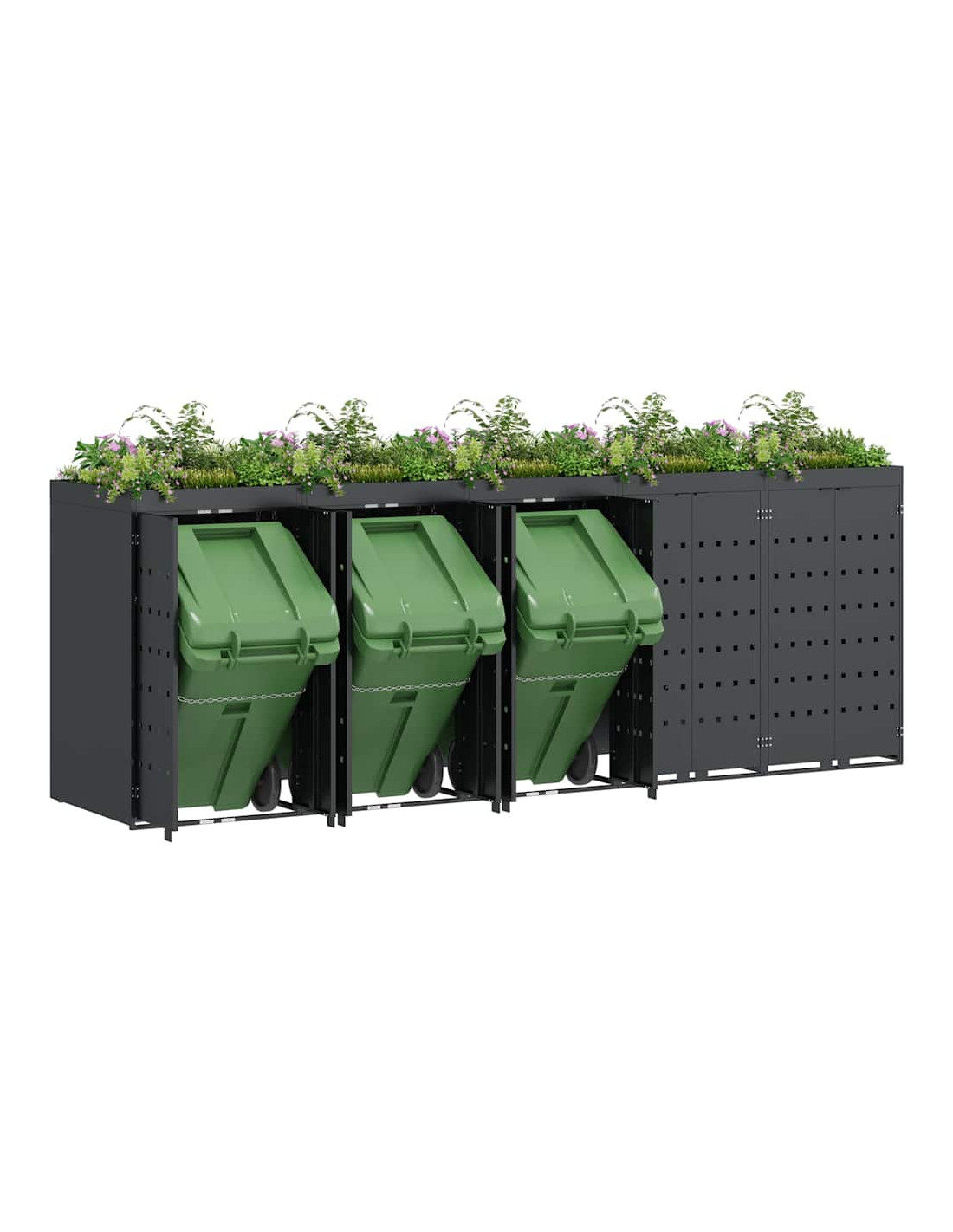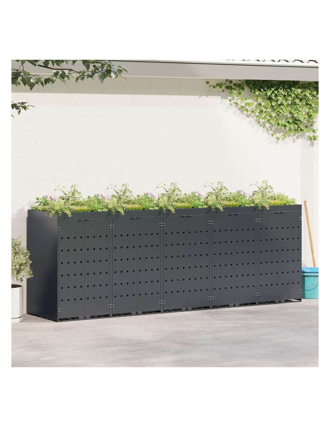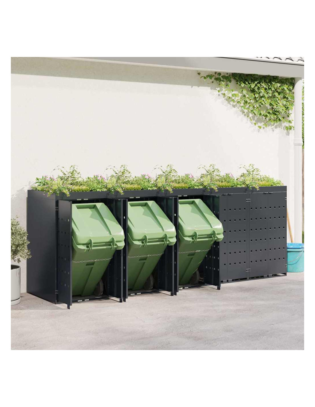 Questo contenitore per rifiuti con tetto da giardino è una soluzione chic per mantenere in ordine l'area esterna. È progettato per adattarsi bene a giardini e terrazze. Con il suo design minimale e linee pulite, si integra facilmente in ogni ambiente moderno. Nasconde i bidoni in modo elegante e permette di coltivare piante o erbe, portando un po'di natura nel tuo spazio.