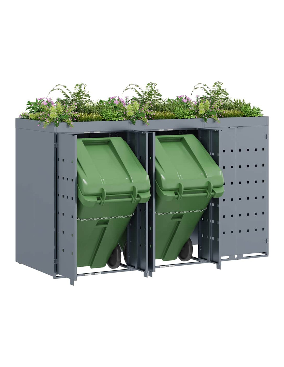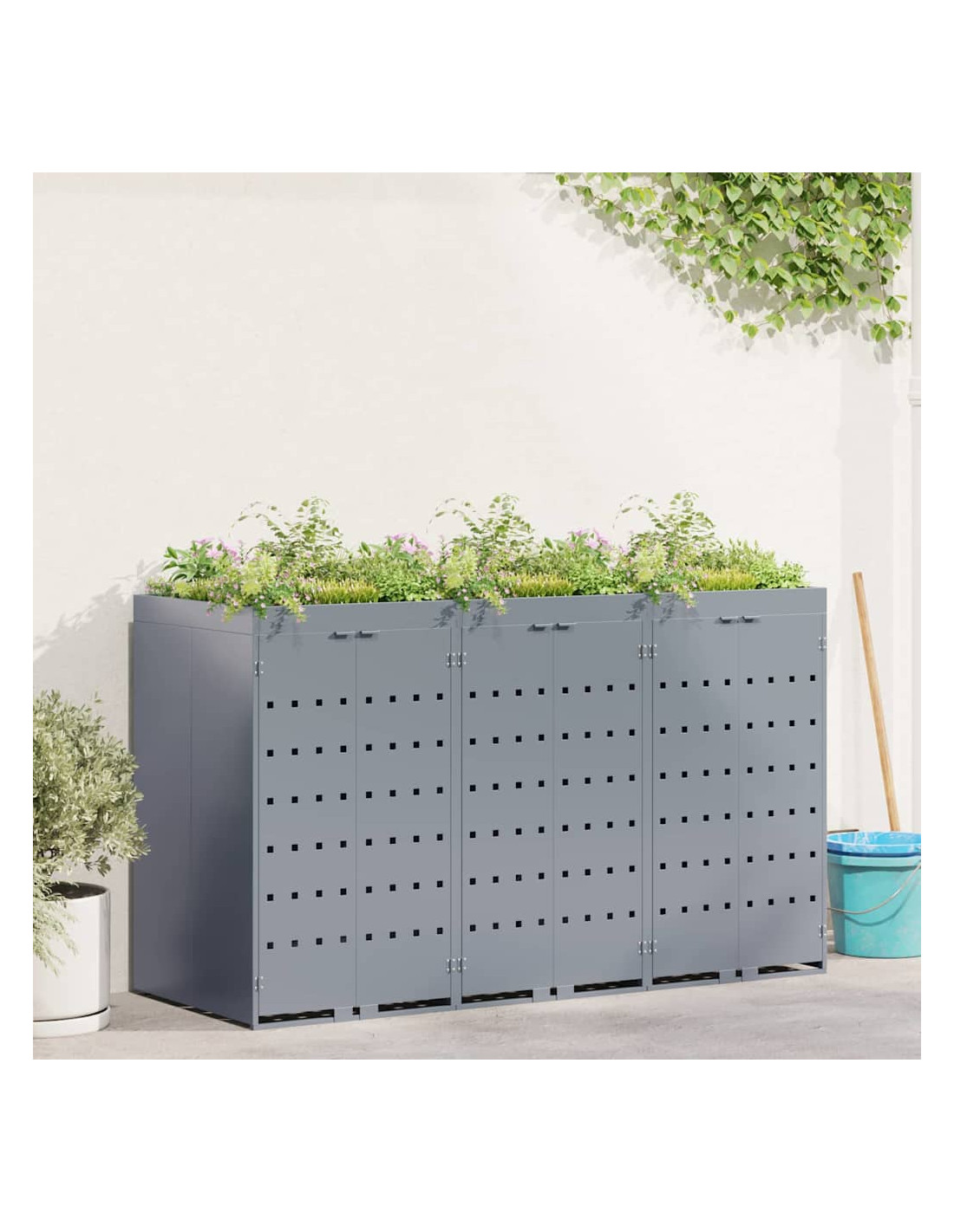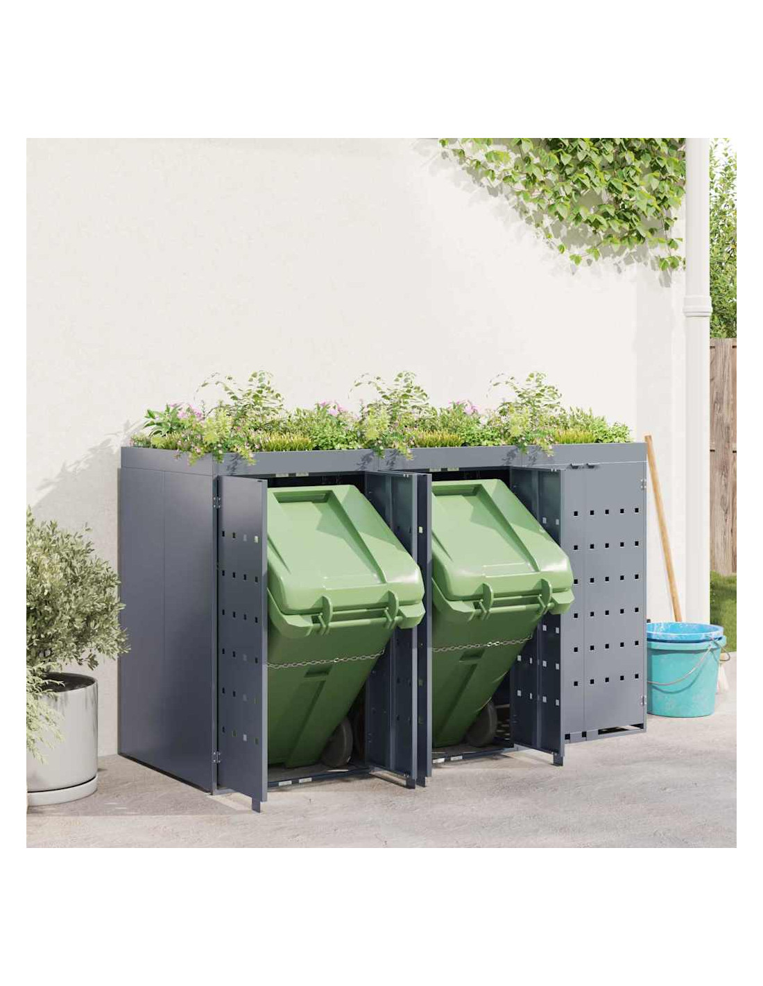 Questo contenitore per rifiuti con tetto da giardino è una soluzione chic per mantenere in ordine l'area esterna. È progettato per adattarsi bene a giardini e terrazze. Con il suo design minimale e linee pulite, si integra facilmente in ogni ambiente moderno. Nasconde i bidoni in modo elegante e permette di coltivare piante o erbe, portando un po'di natura nel tuo spazio.