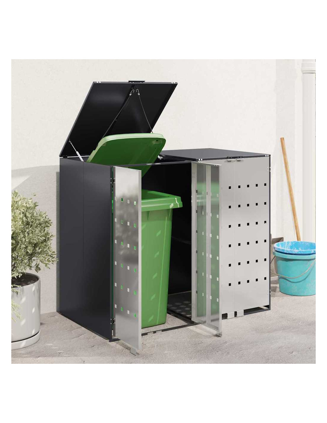 Questo ripostiglio per bidoni è una soluzione elegante per tenere ordinati i contenitori per i rifiuti all'aperto, mantenendo l'aspetto del giardino o della terrazza attraente. Il design moderno si integra bene con diversi ambienti esterni, combinando funzionalità e un bel look. Progettato per l'esterno, regge bene alle condizioni meteo, assicurando longevità e aiutando a mantenere tutto in ordine. Perfetto per chi ama l'organizzazione e la pulizia all'aperto, unisce utilità e stile.