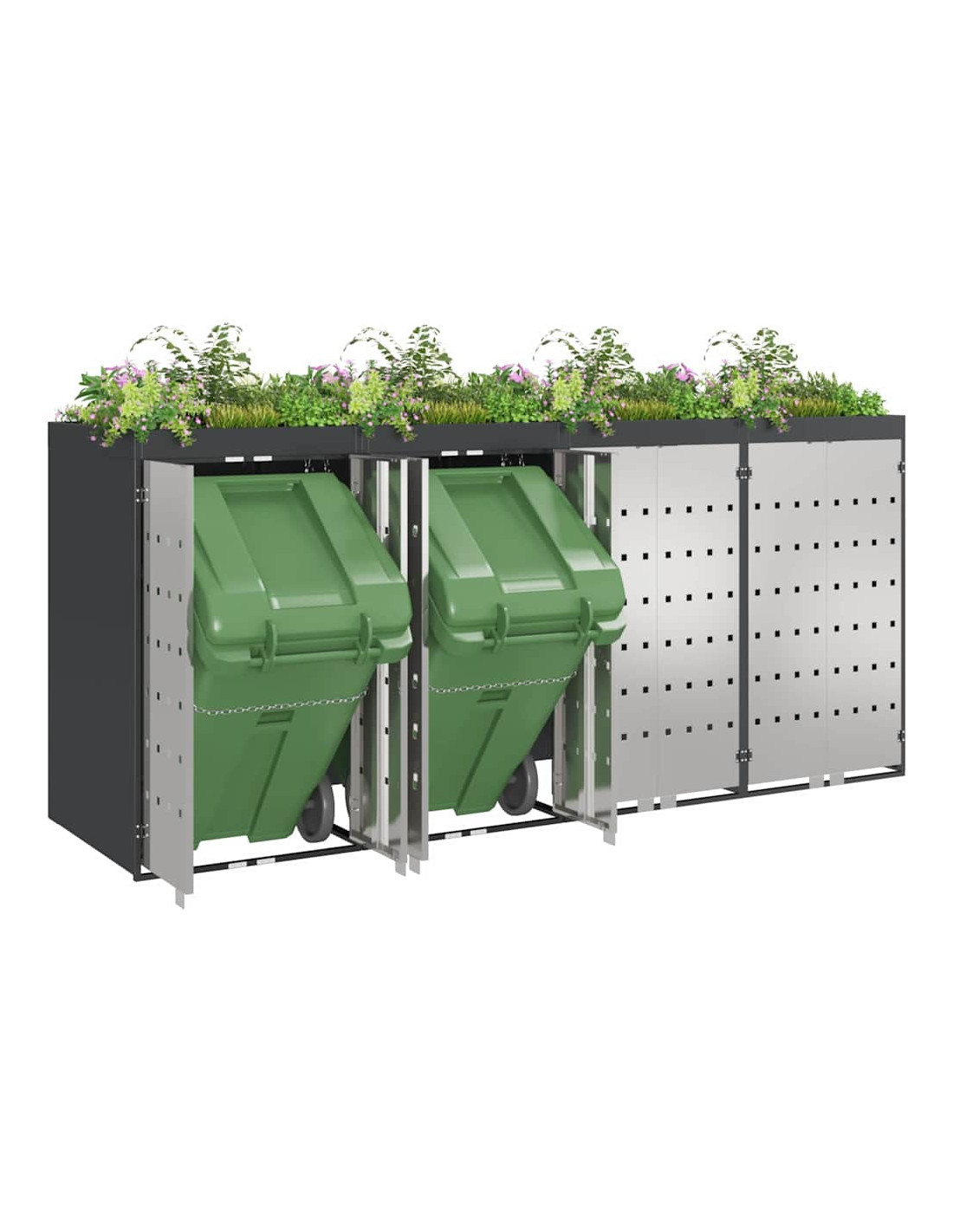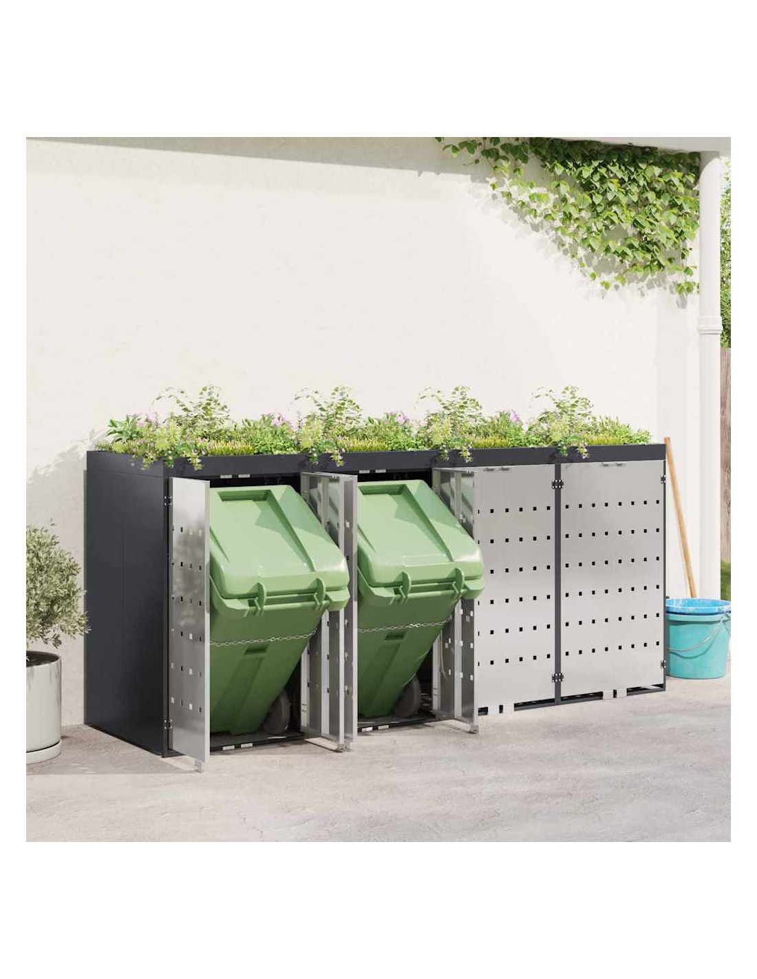 Questo ripostiglio per bidoni è una soluzione elegante per tenere ordinati i contenitori per i rifiuti all'aperto, mantenendo l'aspetto del giardino o della terrazza attraente. Il design moderno si integra bene con diversi ambienti esterni, combinando funzionalità e un bel look. Progettato per l'esterno, regge bene alle condizioni meteo, assicurando longevità e aiutando a mantenere tutto in ordine. Perfetto per chi ama l'organizzazione e la pulizia all'aperto, unisce utilità e stile.