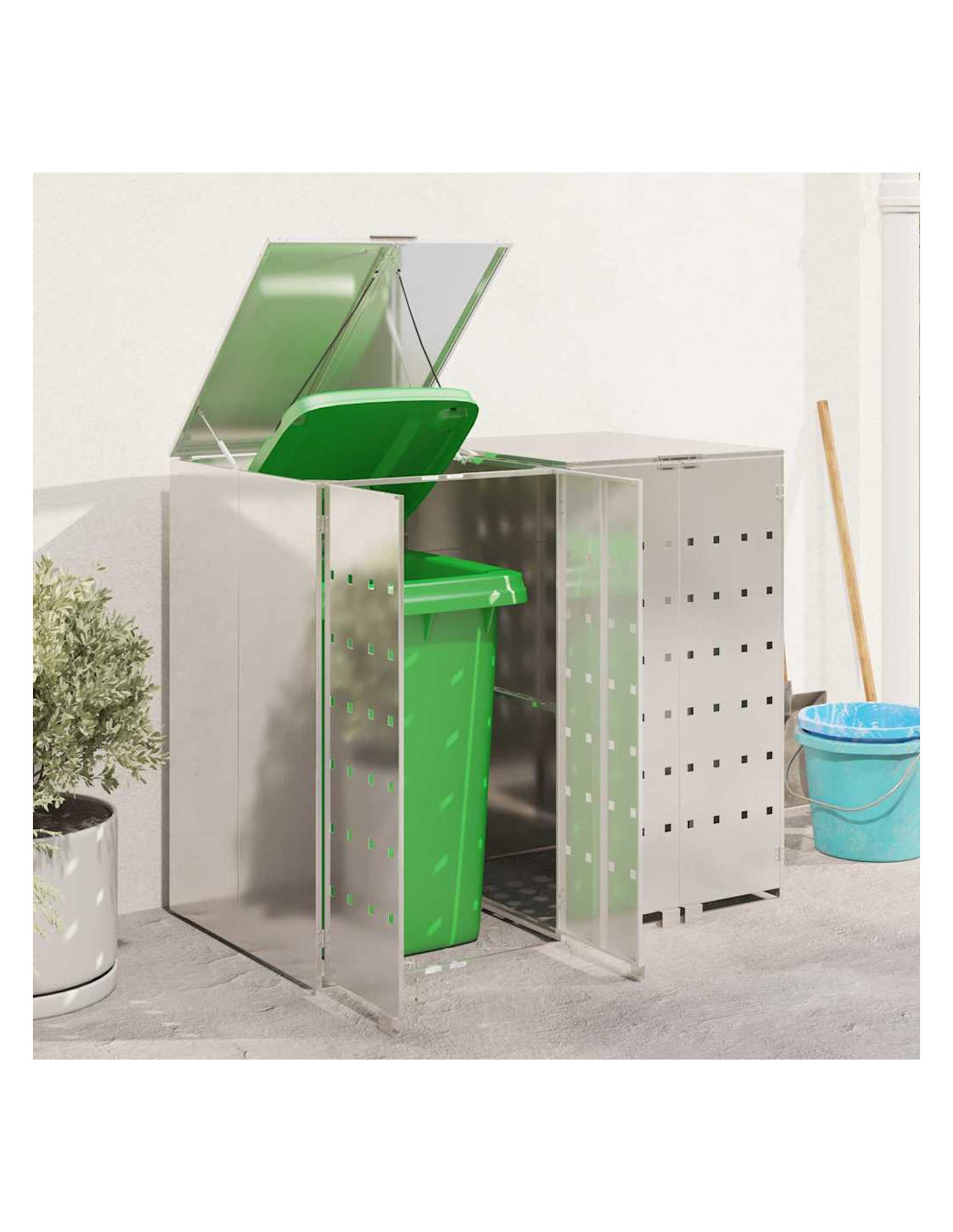 Questo ripostiglio per bidoni è una soluzione elegante per tenere ordinati i contenitori per i rifiuti all'aperto, mantenendo l'aspetto del giardino o della terrazza attraente. Il design moderno si integra bene con diversi ambienti esterni, combinando funzionalità e un bel look. Progettato per l'esterno, regge bene alle condizioni meteo, assicurando longevità e aiutando a mantenere tutto in ordine. Perfetto per chi ama l'organizzazione e la pulizia all'aperto, unisce utilità e stile.
