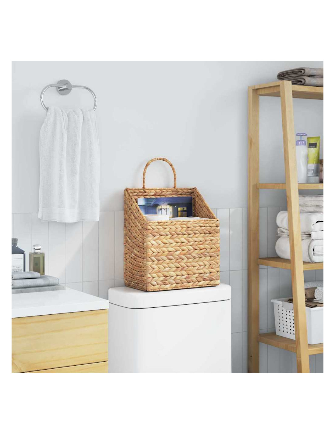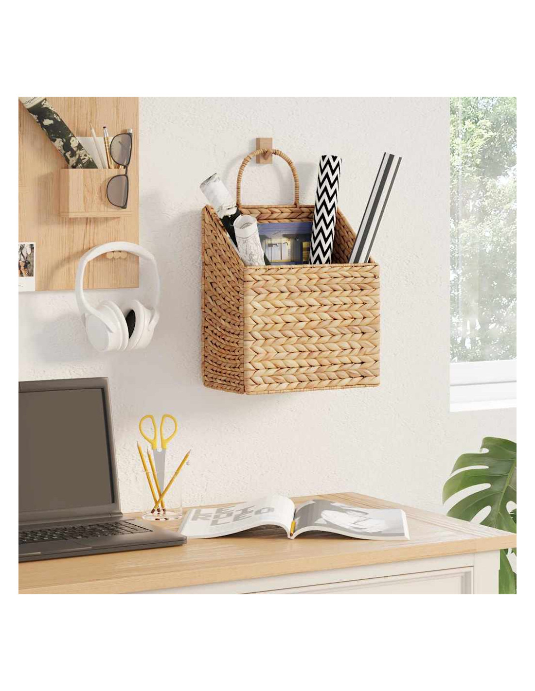 - Materiali: Realizzato in giacinto d'acqua, questo cesto è sostenibile e bello. Il giacinto d'acqua non solo è ecologico, ma ha anche una texture tipo rattan, che lo rende visivamente attraente. Inoltre, la sua tonalità naturale aggiunge calore, rendendolo perfetto per interni dal gusto rustico. La leggerezza e la robustezza del giacinto d'acqua lo rendono facile da maneggiare e di lunga durata.