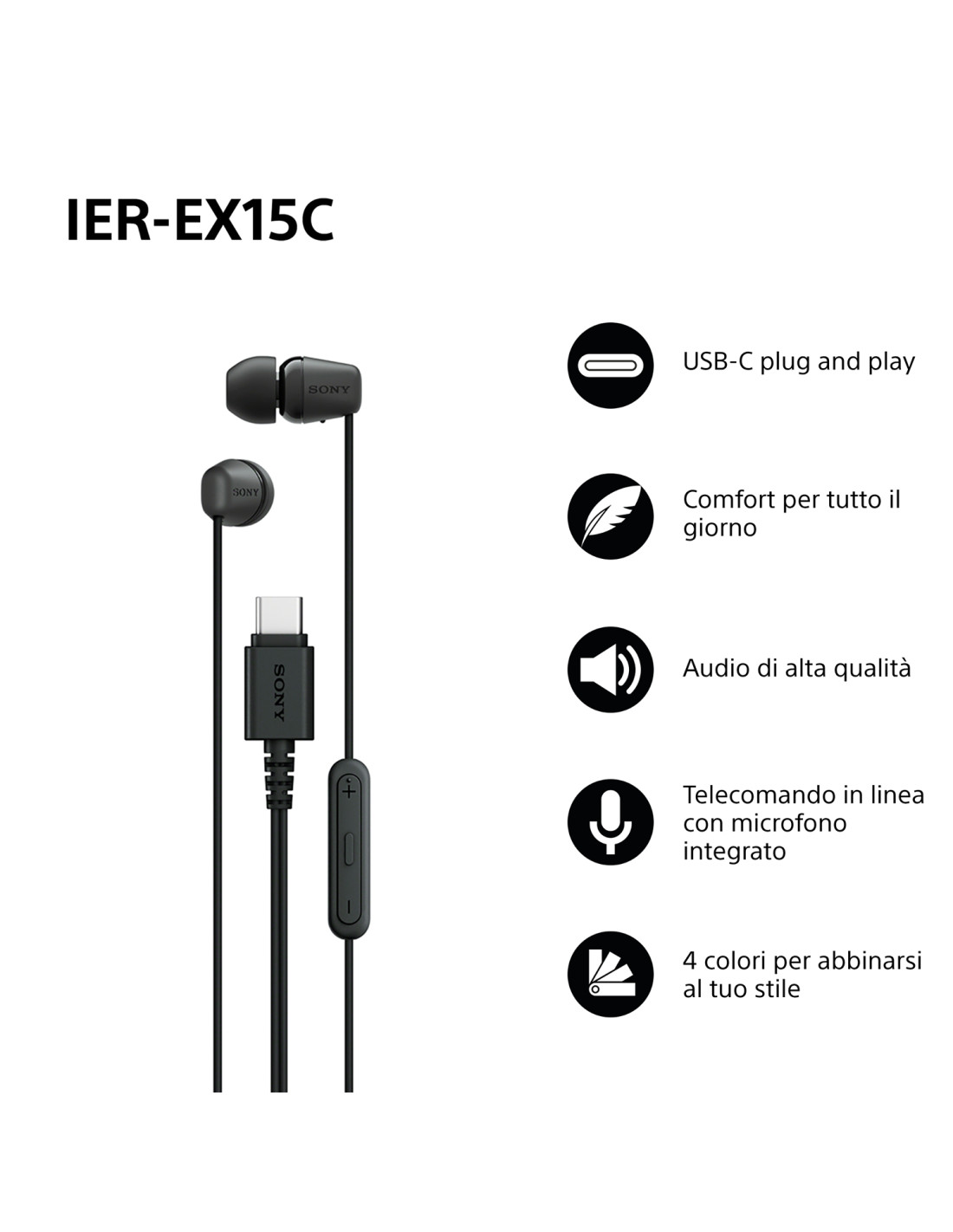 Sony IER-EX15C. Tipo di prodotto: Auricolare. Tecnologia di connessione: Cablato. Utilizzo raccomandato: Musica e Chiamate, Lunghezza cavo: 1,2 m. Peso: 3 g. Colore del prodotto: Nero