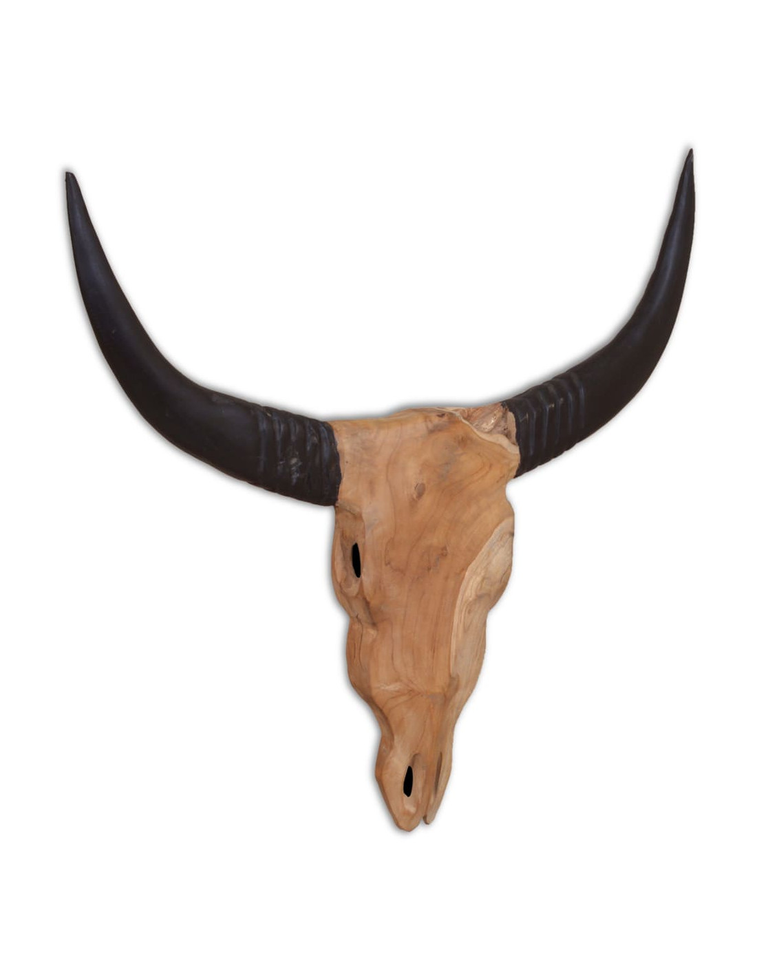 L'elemento decorativo, raffigurante una versione stilizzata di un teschio di toro con le corna, è stato realizzato a mano con legno di teak. Ciò gli conferisce un fascino unico e rustico.