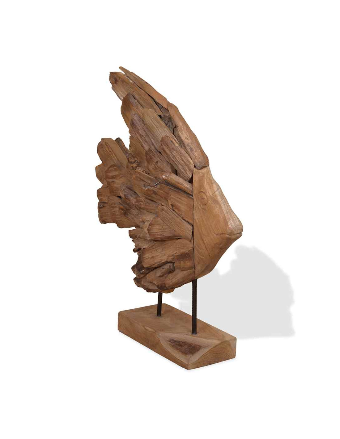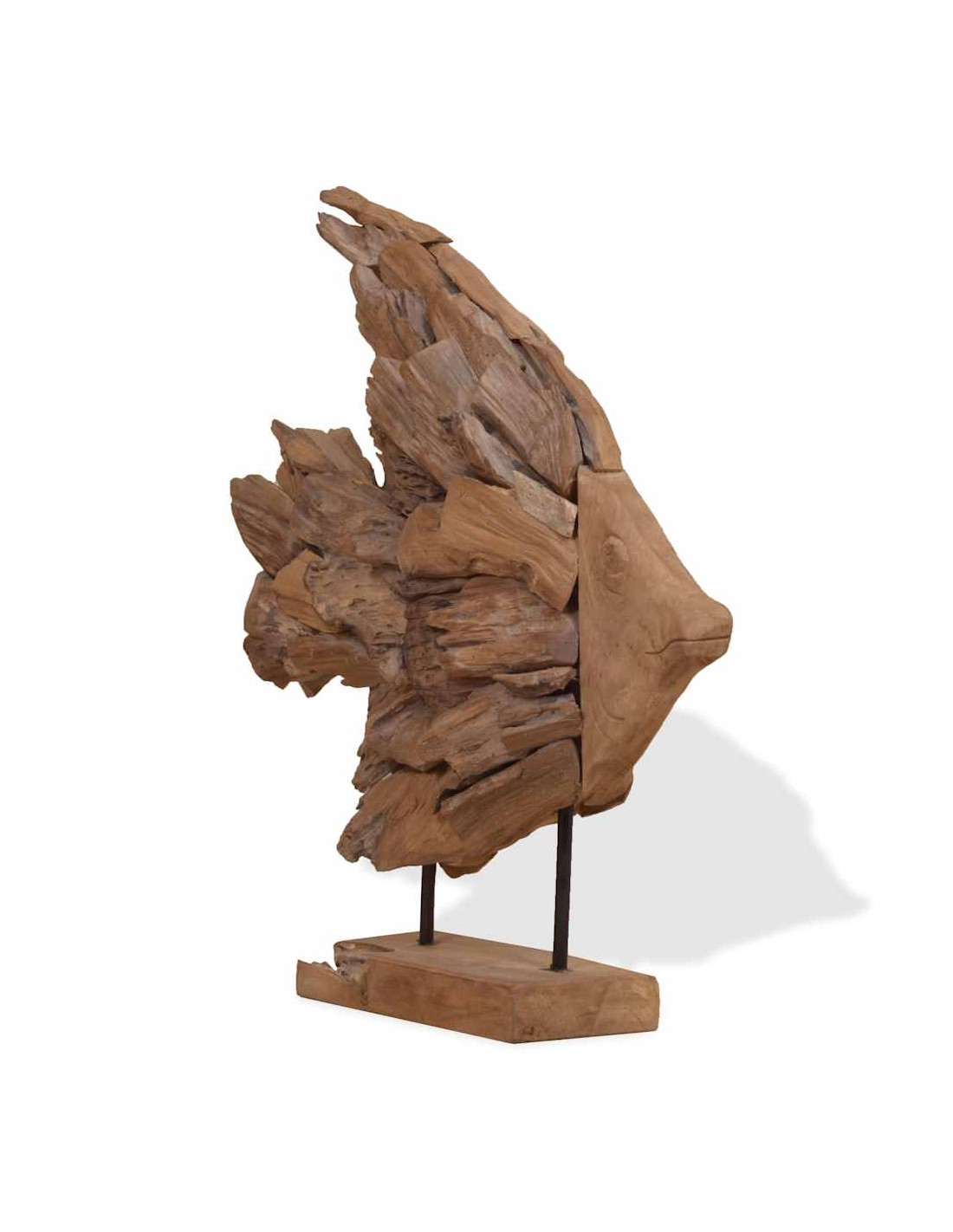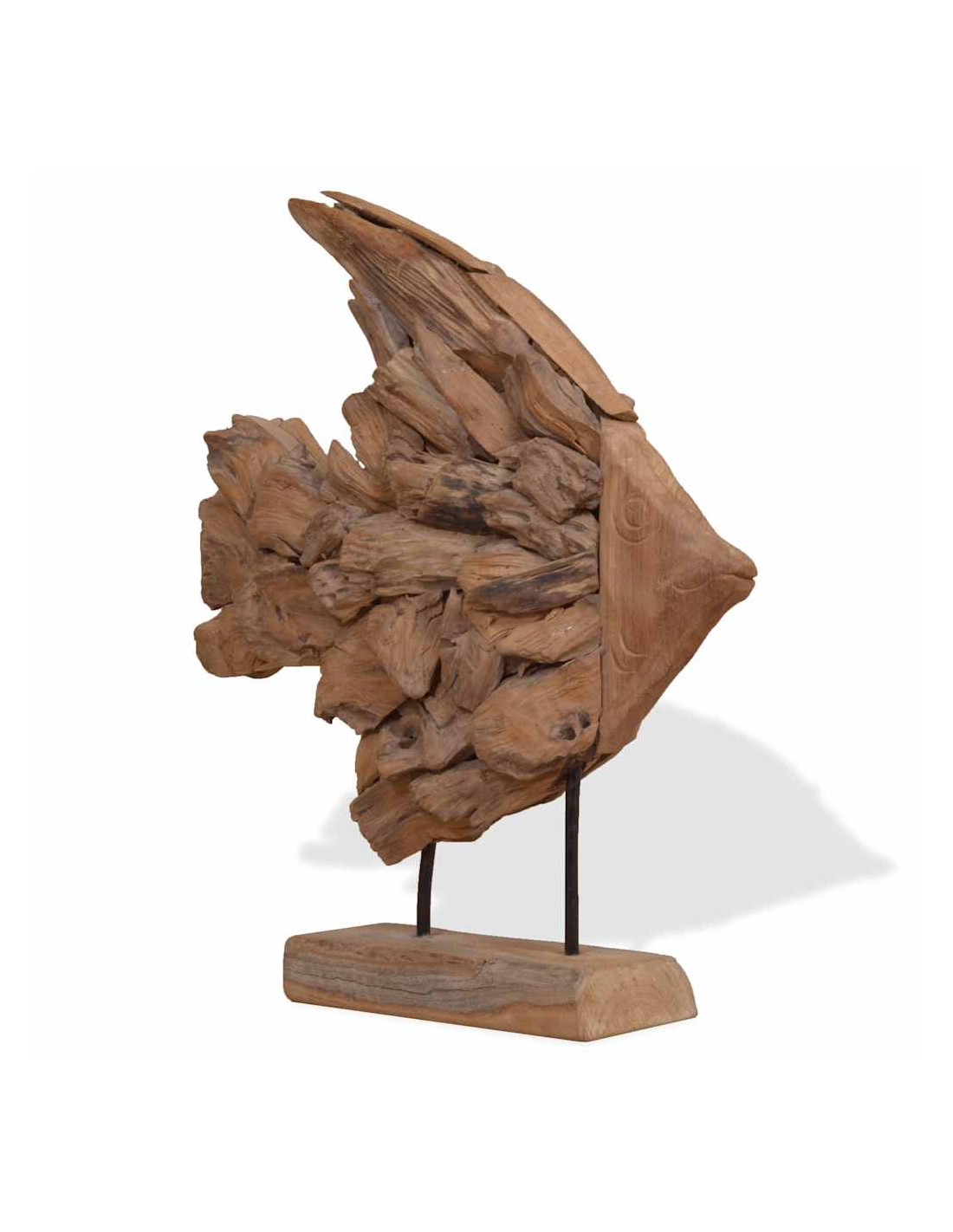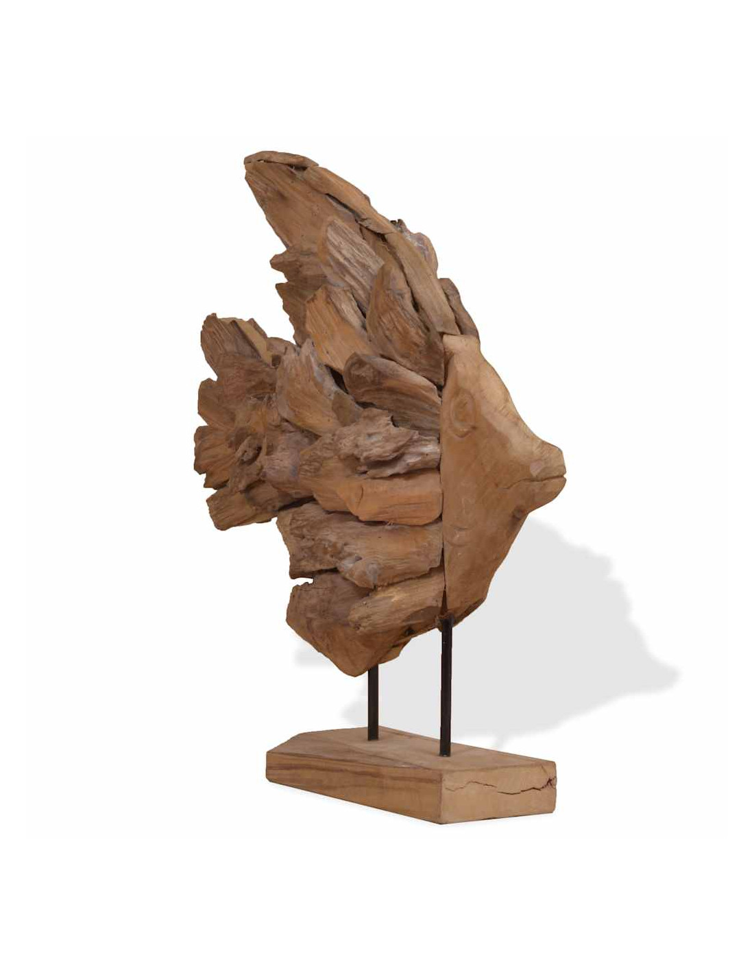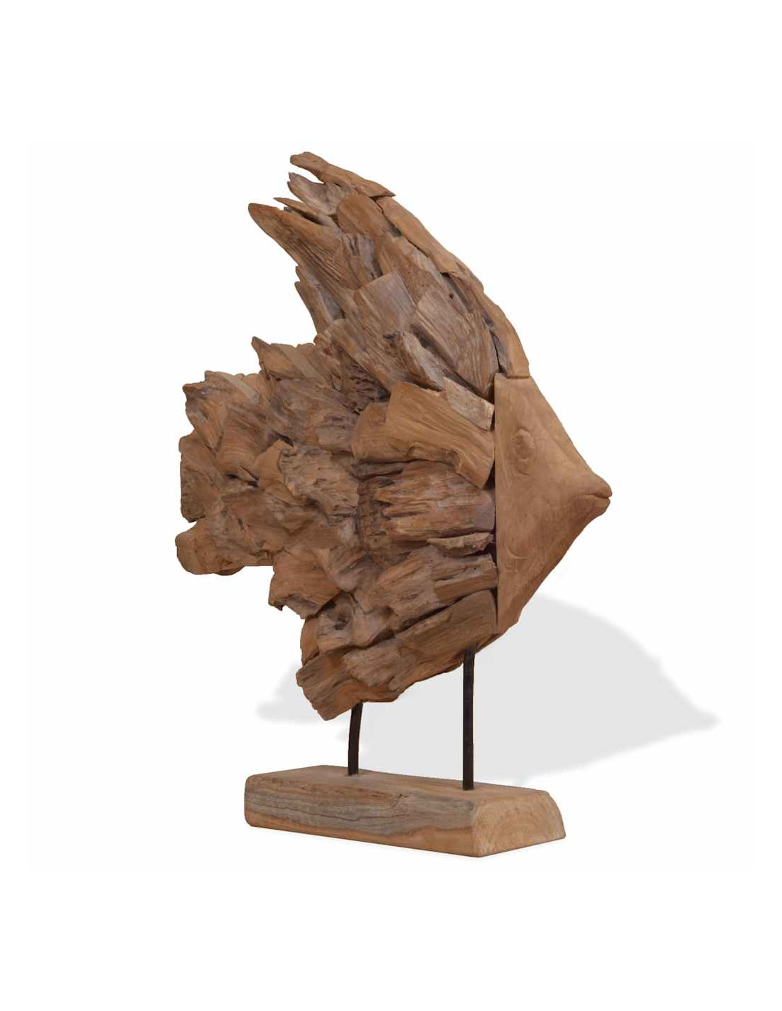La decorazione è stata realizzata a mano con pezzi naturali di teak, che gli conferiscono il suo fascino unico e rustico. Nota importante: Il colore e le forme del legno possono variare da pezzo a pezzo, rendendo unica ciascuna delle nostre statue di pesci; La consegna è casuale.