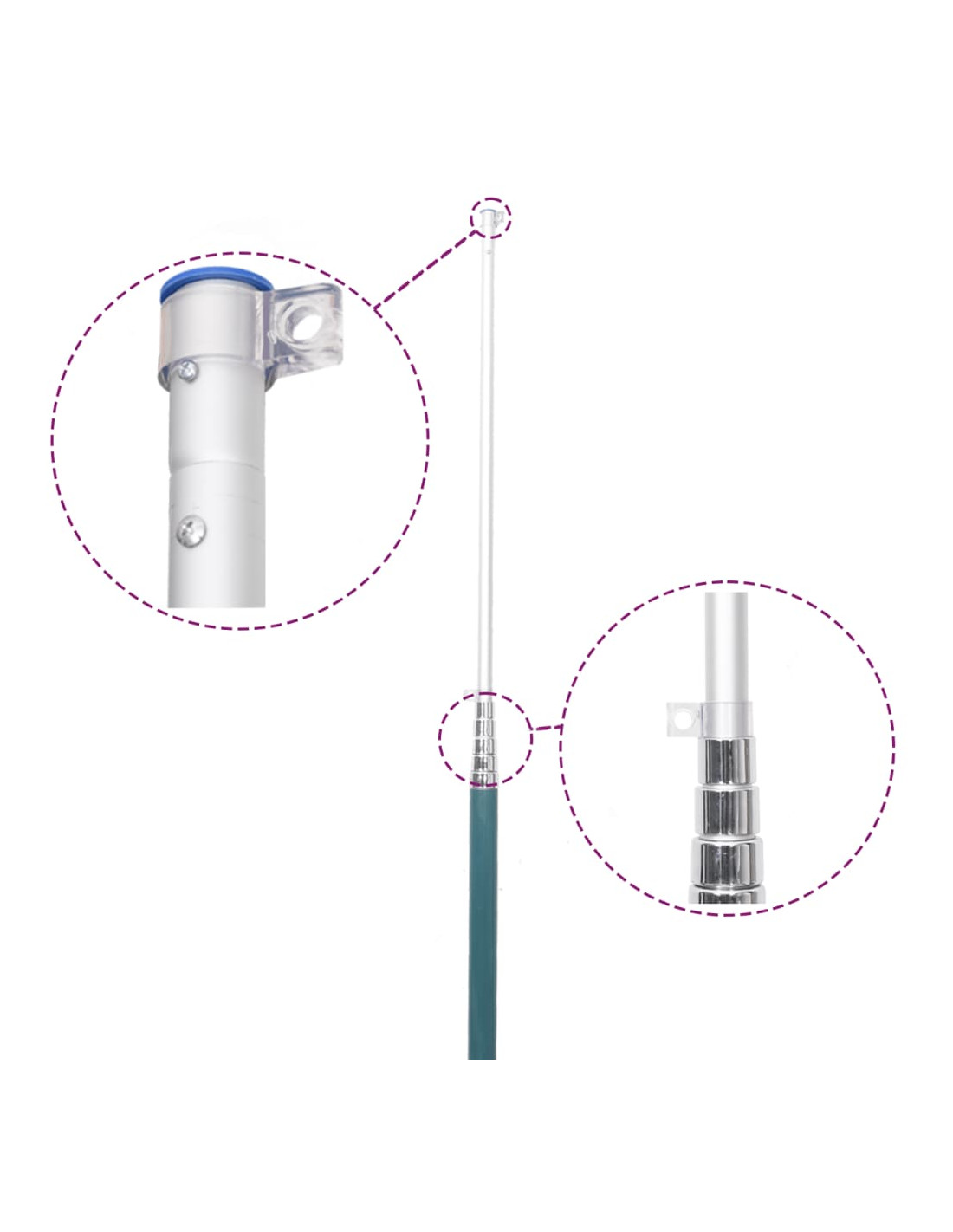 - Asta portabandiera resistente alle intemperie: L'asta portabandiera è realizzata in alluminio, che offre robustezza e resistenza alla corrosione. L'alluminio resistente alle intemperie rende durevole l'asta telescopica della bandiera.