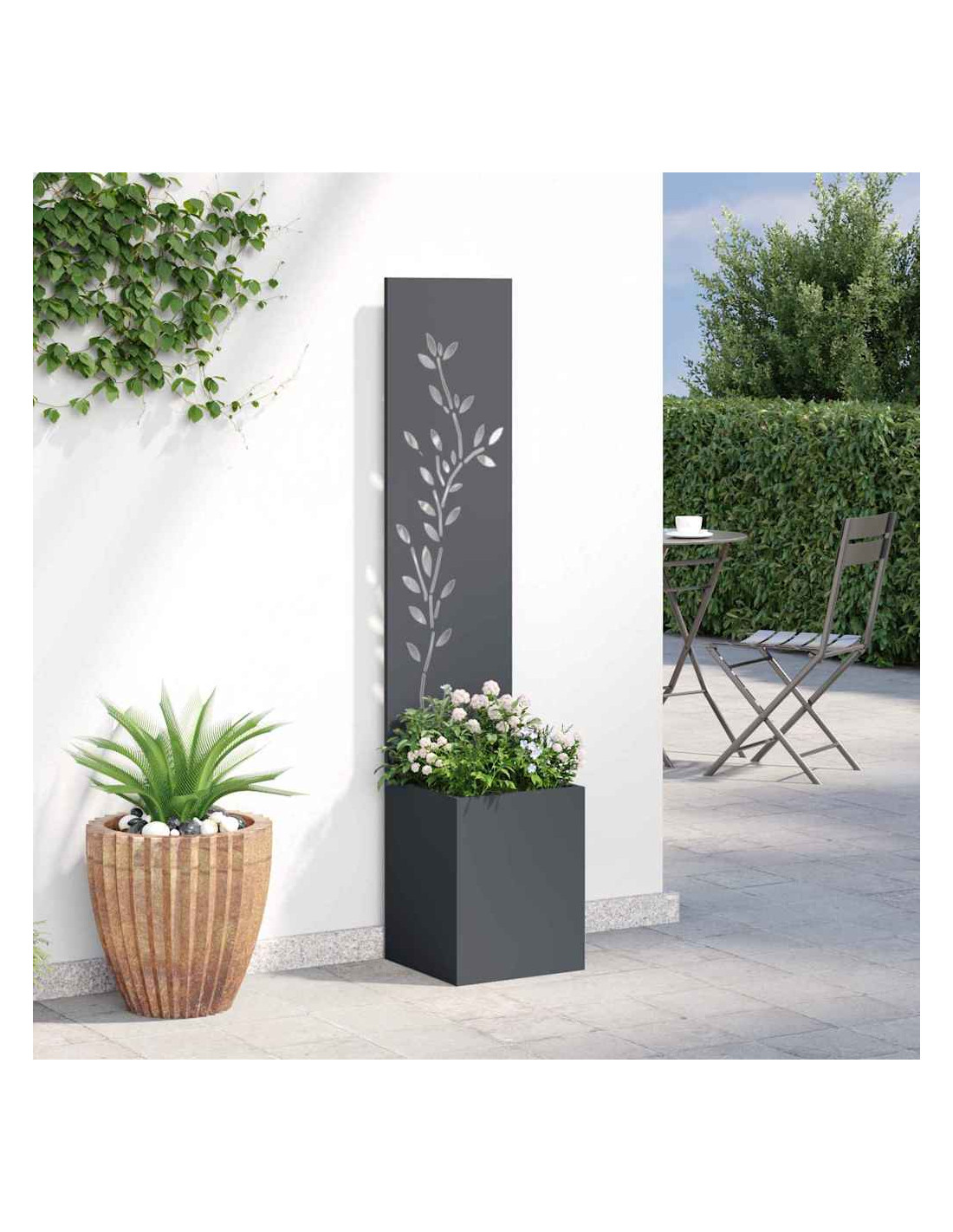 - Costruzione in Acciaio Questo paravento è resistente e offre una barriera solida contro le intemperie e gli sguardi curiosi. Con poca manutenzione, durerà a lungo. La finitura opaca e liscia garantisce privacy e aggiunge un aspetto elegante al tuo giardino o terrazza.