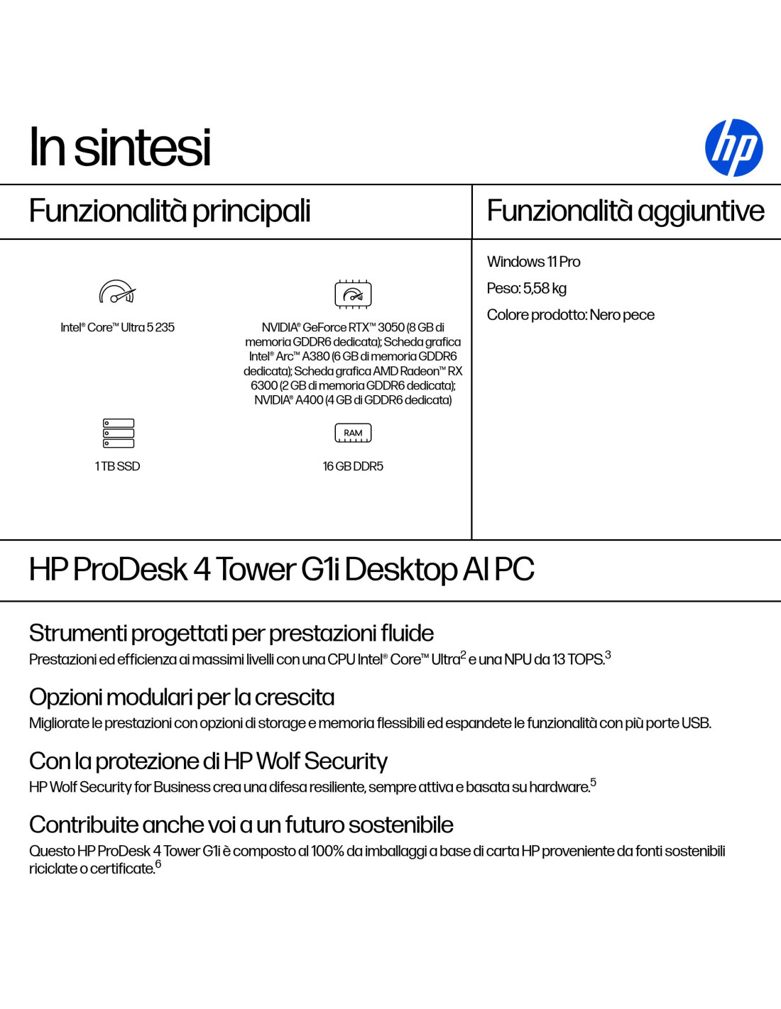 HP ProDesk 4 Tower G1i offre funzionalità di produttività essenziali in un PC desktop AI conveniente per le aziende in crescita. Potente e affidabile, con la possibilità di scegliere tra GPU, processore Intel Core™ Ultra[2] e NPU da 13 TOPS[3], per ottimizzare la gestione delle attività quotidiane e sfruttare il potenziale dell'AI.