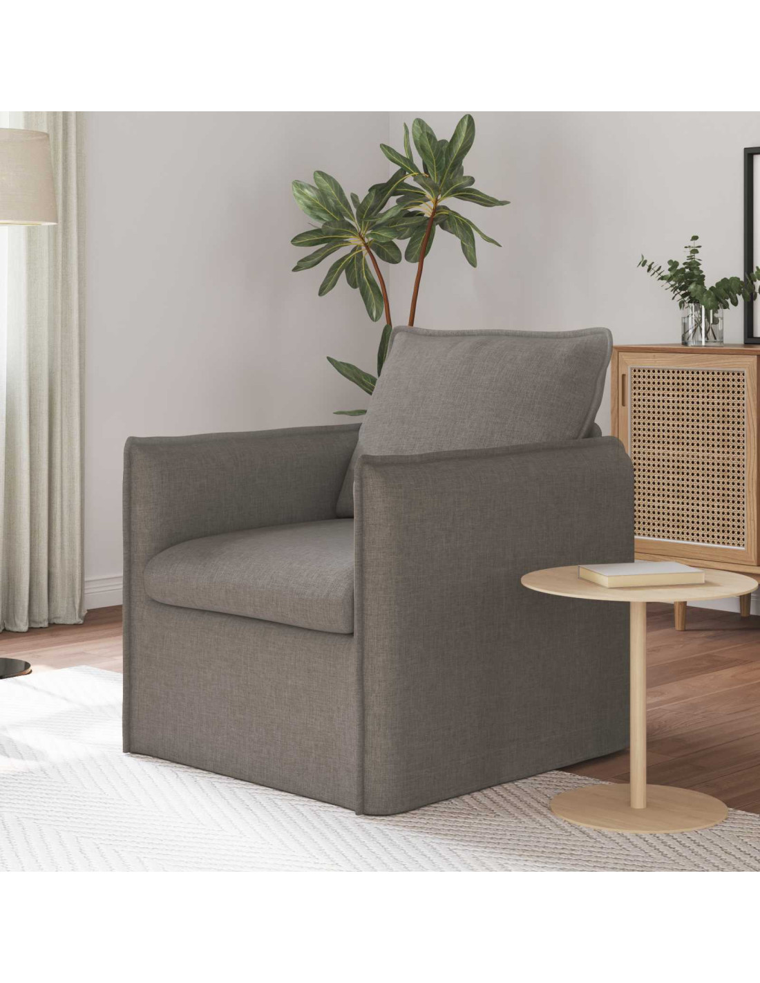 - Componenti studiati I cuscini morbidi in schiuma e fibra offrono un comfort super, adattandosi alle curve del corpo. I braccioli in legno ingegnerizzato sono robusti ma raffinati, aggiungendo un tocco di stile. Le gambe in plastica a cimabella danno un supporto stabile ma discreto, mantenendo l'aspetto moderno.