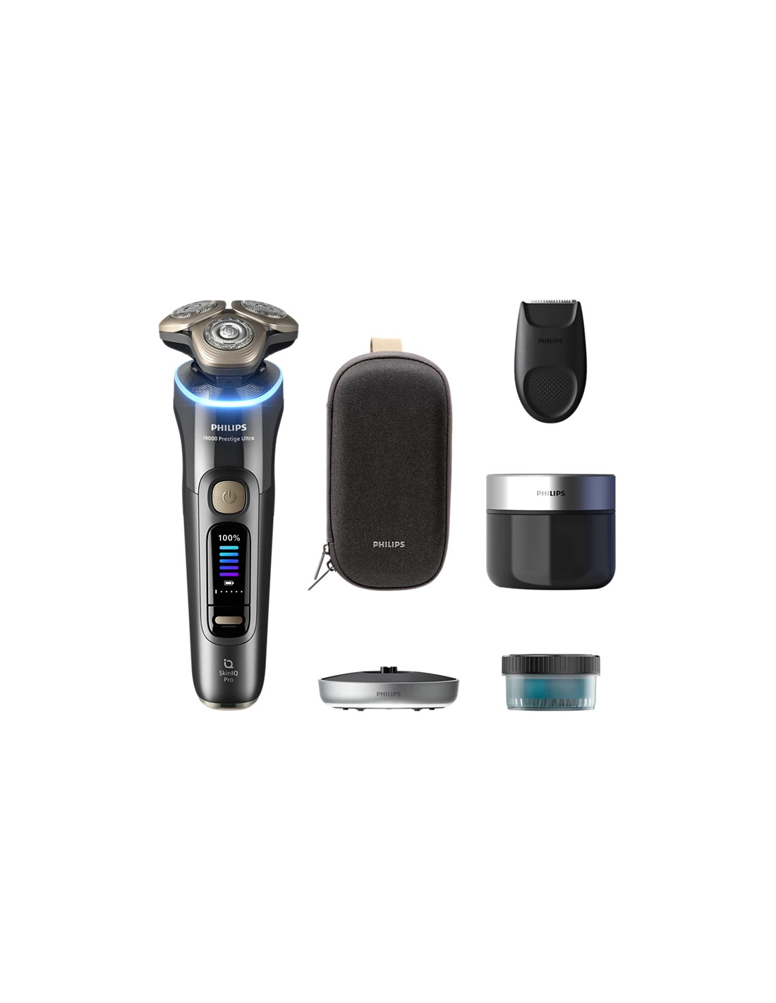Il nostro rasoio più innovativo Philips i9000 Prestige Ultra con sistema Lift & Cut a tripla azione che taglia i peli alla radice per una rasatura accurata che dura tutto il giorno,