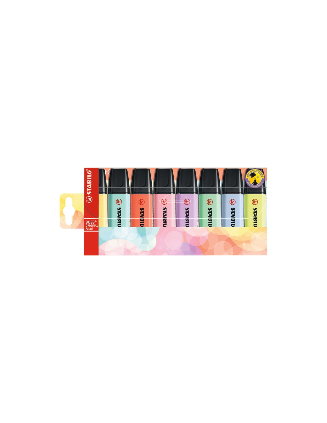 STABILO Boss Original Pastel. Quantità per pacco: 8 pz, Colore penna: Multicolore, Tipo di punta: Punta smussata. Larghezza imballo: 18 mm, Profondità imballo: 220 mm, Altezza imballo: 137 mm. Paese di origine: Germania
