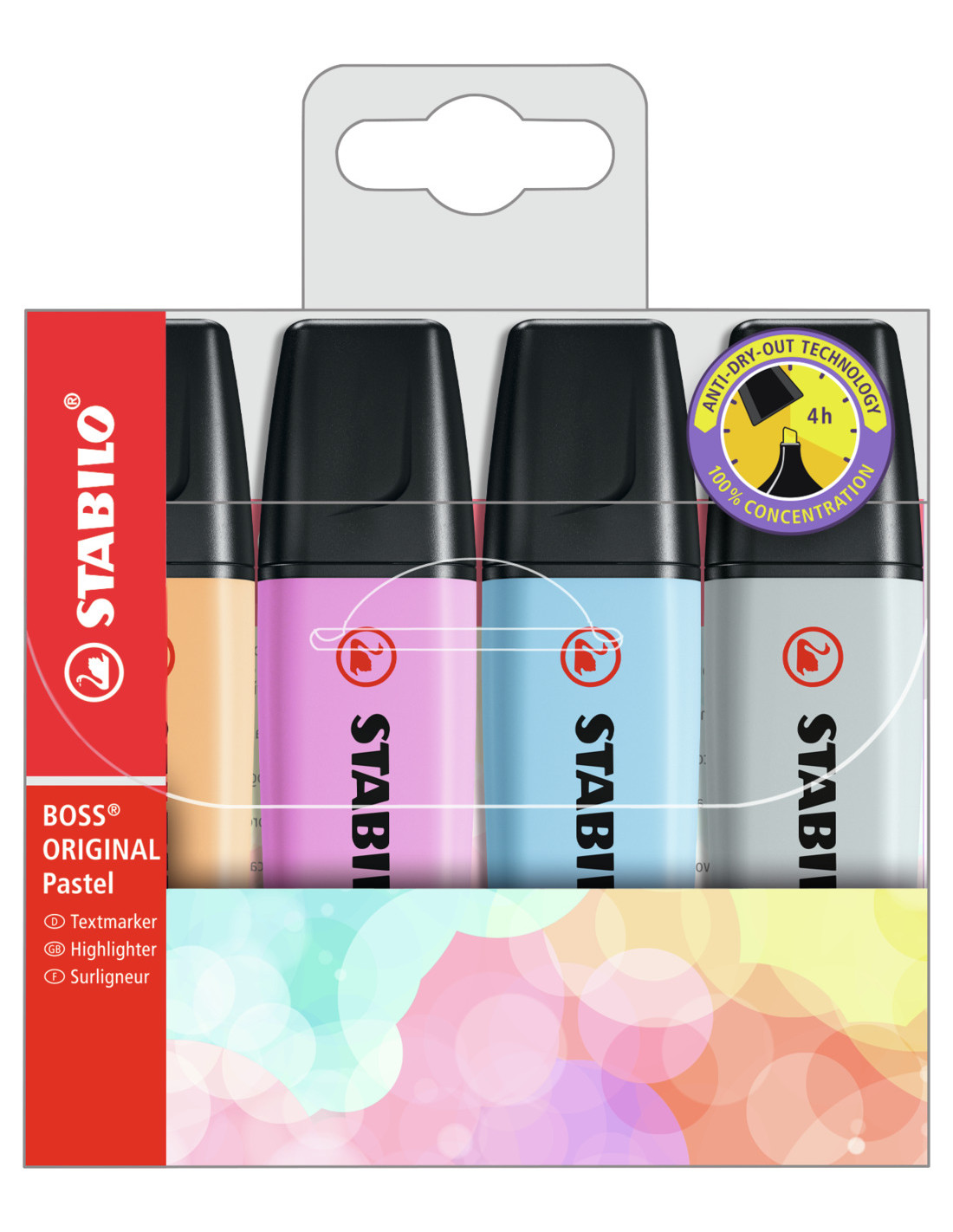 STABILO Boss Original Pastel. Quantità per pacco: 4 pz, Colore penna: Multicolore, Tipo di punta: Punta smussata. Larghezza imballo: 18 mm, Profondità imballo: 110 mm, Altezza imballo: 105 mm. Paese di origine: Germania
