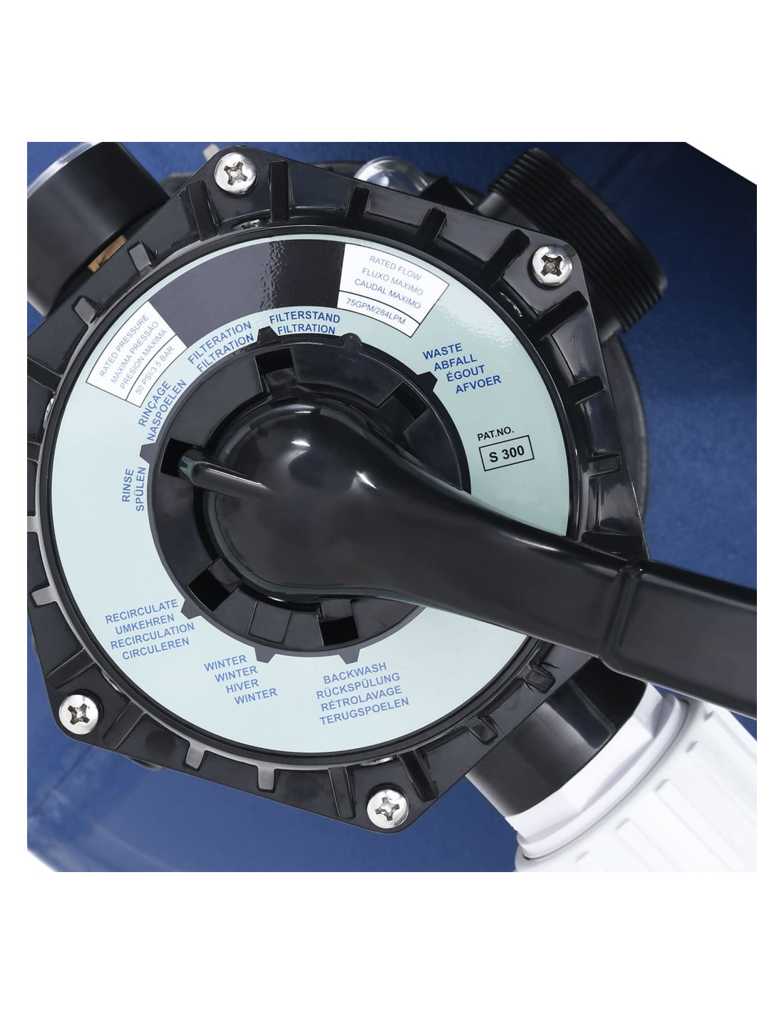 Realizzato in plastica ad alta densità, il filtro a sabbia è molto resistente. Il filtro è progettato per raggiungere una portata di 18 m³/h. La pressione massima di esercizio è di 3,5 bar. Per iniziare l'operazione sono necessari 50 kg di sabbia filtrante (non inclusa). Il filtro è dotato di una valvola multiporta a 7 posizioni: filtro (per filtrare la struttura dell'acqua), controlavaggio (per la pulizia del filtro), risciacquo (per il lavaggio del sistema di filtraggio), inverno (per l'inverno), ricircolo (per bypassare il letto filtrante per la piscina/spa), nonché chiuso (per spegnere tutto il flusso d'acqua al filtro) e scarico.