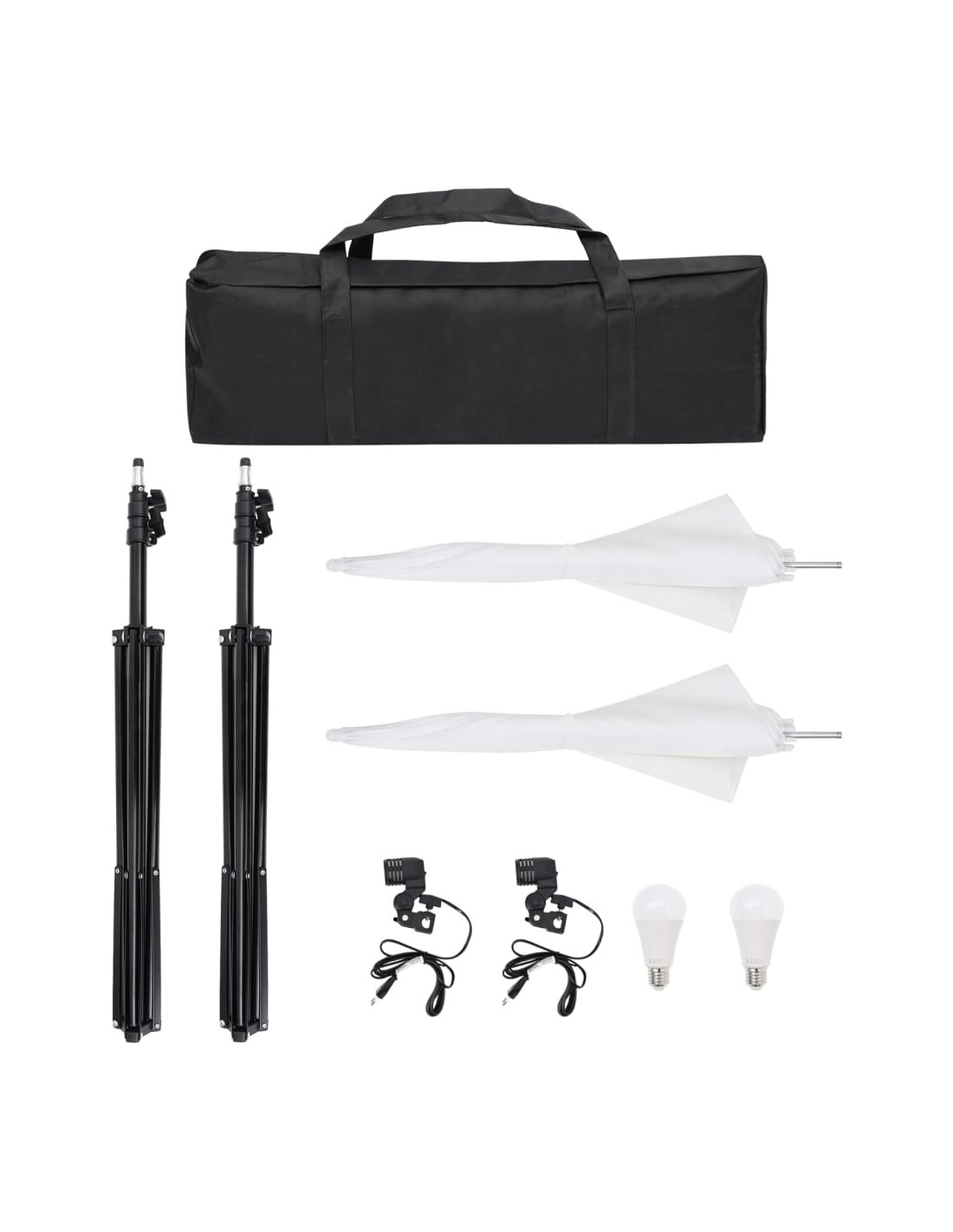 - Eccellenti prestazioni di illuminazione: Utilizzando le lampade a luce diurna con una temperatura di colore di 5500 Kelvin, è possibile catturare il soggetto in modo naturale. I due ombrelli bianchi forniscono una luce soffusa, in modo da evitare le ombre marcate.