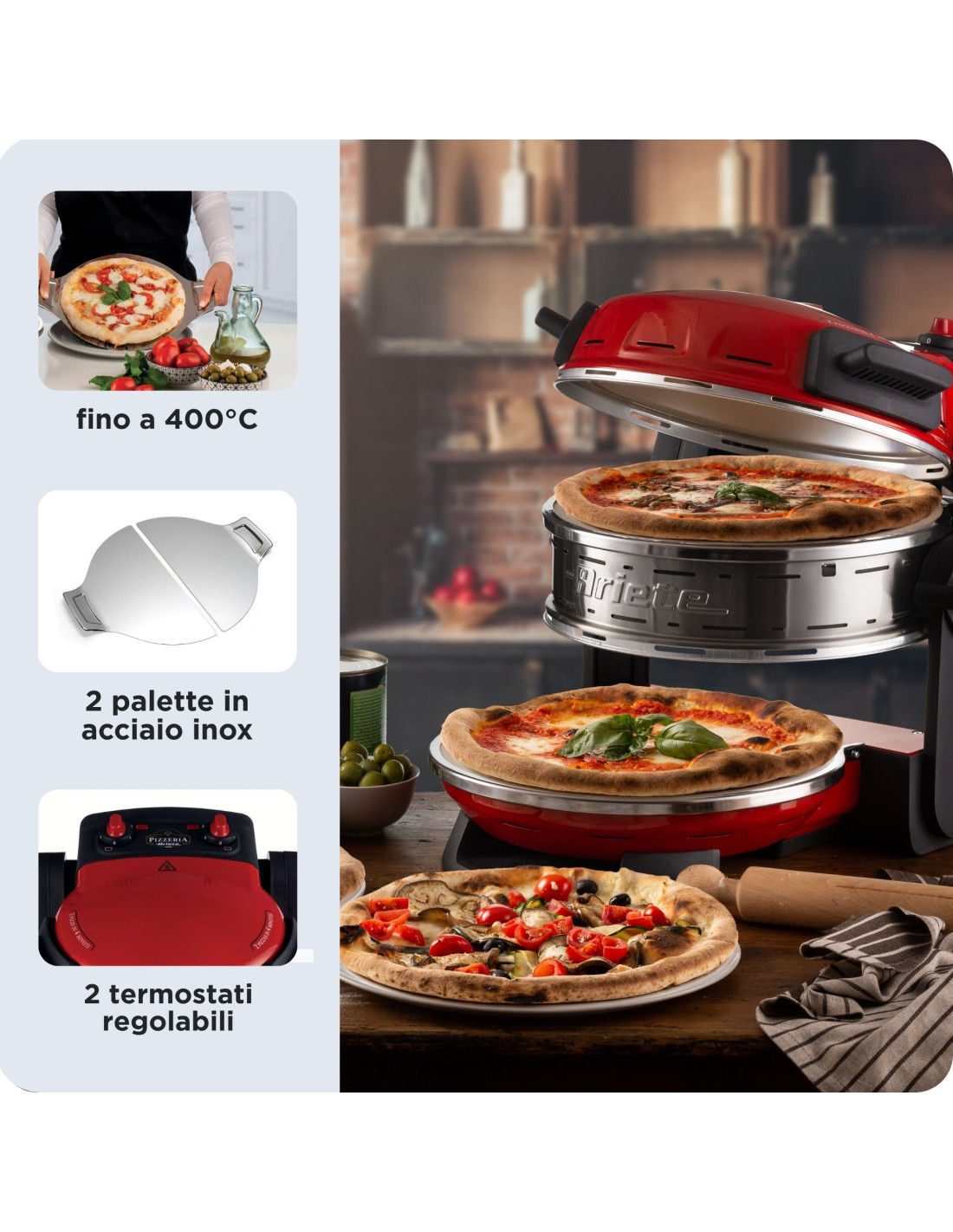 Ami la pizza e ami prepararla in casa? Ti piace cucinarla per cene in famiglia o tra amici? Spesso succede di dover aspettare prima di mangiare perchè il forno pizza standard permette di cuocere 1 sola pizza per volta.Il Forno Pizza Doppio “Pizzeria Ariete" è la soluzione ideale. Potrai cuocere 2 pizze contemporaneamente: 2 zone separate, una superiore e una inferiore, con 2 termostati indipendenti per gestire la cottura in modo separato.In entrambe le zone di cottura, le pietre refrattarie da 32 cm sono dotate di un trattamento trasparente antiaderente che rende la pulizia della pietra migliore in quanto i residui e l'olio vengono rimossi più facilmente. Il forno pizza permette di cuocere e/o riscaldare pizza e focacce a 5 livelli di cottura fino a una temperatura massima di 400°C. La cottura veloce ad alta temperatura permette di replicare lo stesso metodo dei forni a legna e in soli 4 minuti si ottiene una cottura perfetta per la pizza fatta in casa, e 2 minuti per la pizza surgelata. Gustare la pizza in casa non è mai stato così semplice e veloce. Provare per credere!