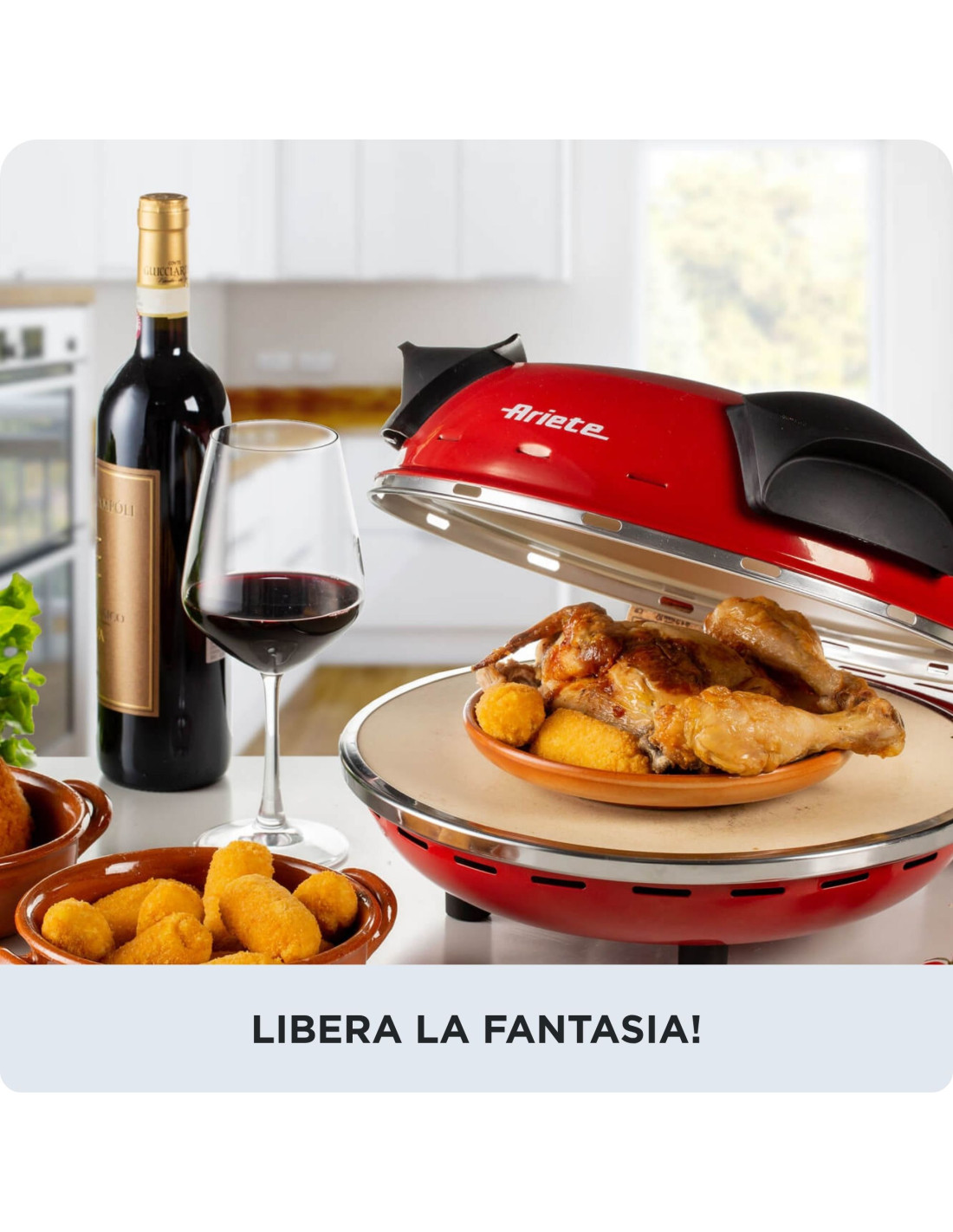 Il forno pizza di Ariete sarà l’alleato in cucina di tutti gli amanti della pizza. Il prodotto migliora le sue prestazioni con una piastra in pietra refrattaria di alta qualità dal diametro di 32cm che permette di cuocere e/o riscaldare pizza e focacce a cinque livelli di cottura, fino a una temperatura massima di 400 gradi. La pietra refrattaria è dotata di un trattamento trasparente antiaderente che rende la pietra refrattaria super resistente a macchie e residui e permette di mantenere la qualità della pietra nel tempo.Il fornetto pizza con la cottura veloce ad alta temperatura permette di replicare lo stesso metodo dei forni a legna e in soli 4 minuti si ottiene una cottura perfetta per la pizza fatta in casa, e 2 minuti per la pizza surgelata. Gustare la pizza in casa non è mai stato così semplice e veloce. Provare per credere!