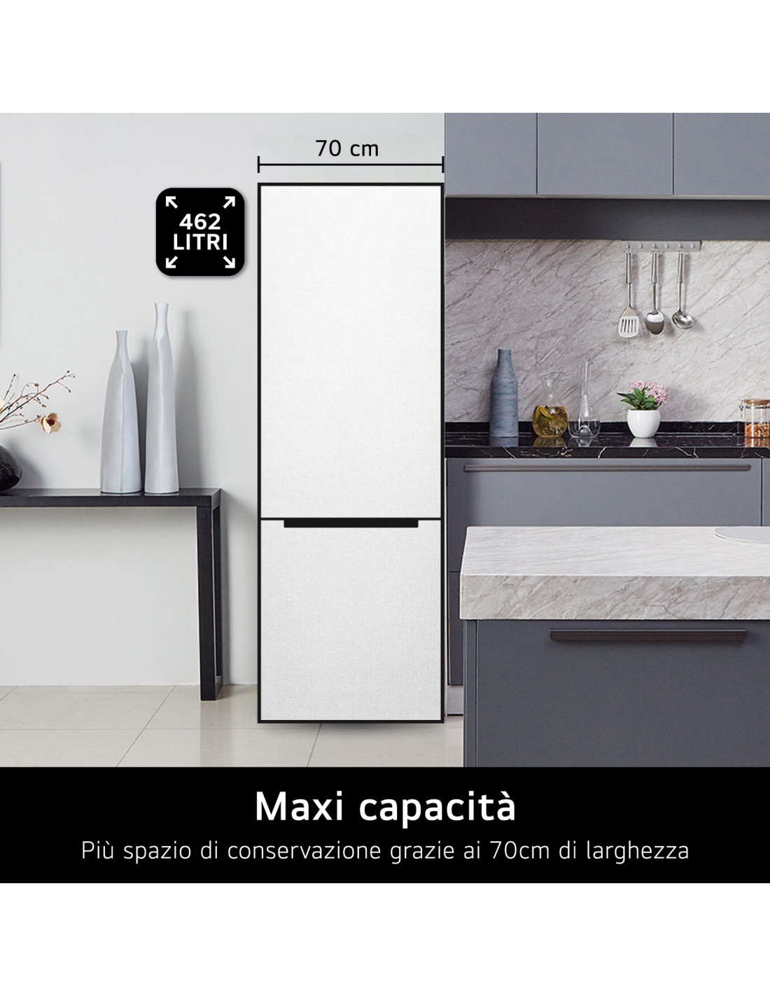Questo nuovo ed elegante frigorifero combinato ha una larghezza di 705 mm e grazie al suo con il suo design sofisticato si integra alla perfezione in qualsiasi cucina.