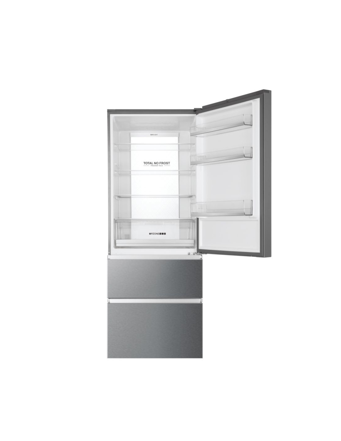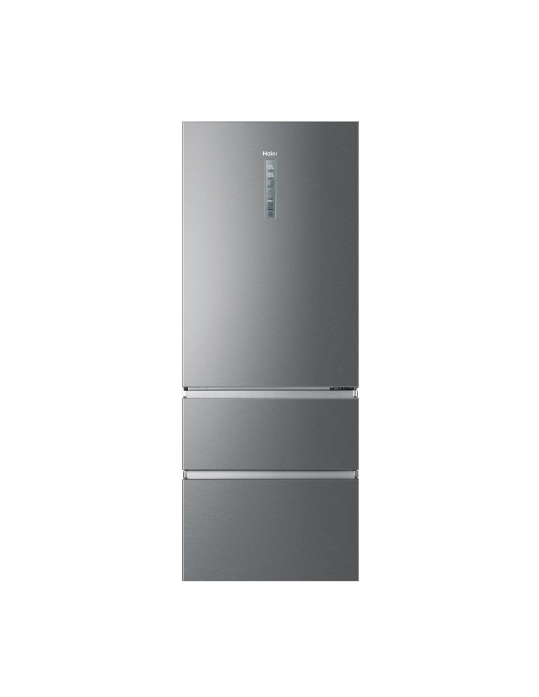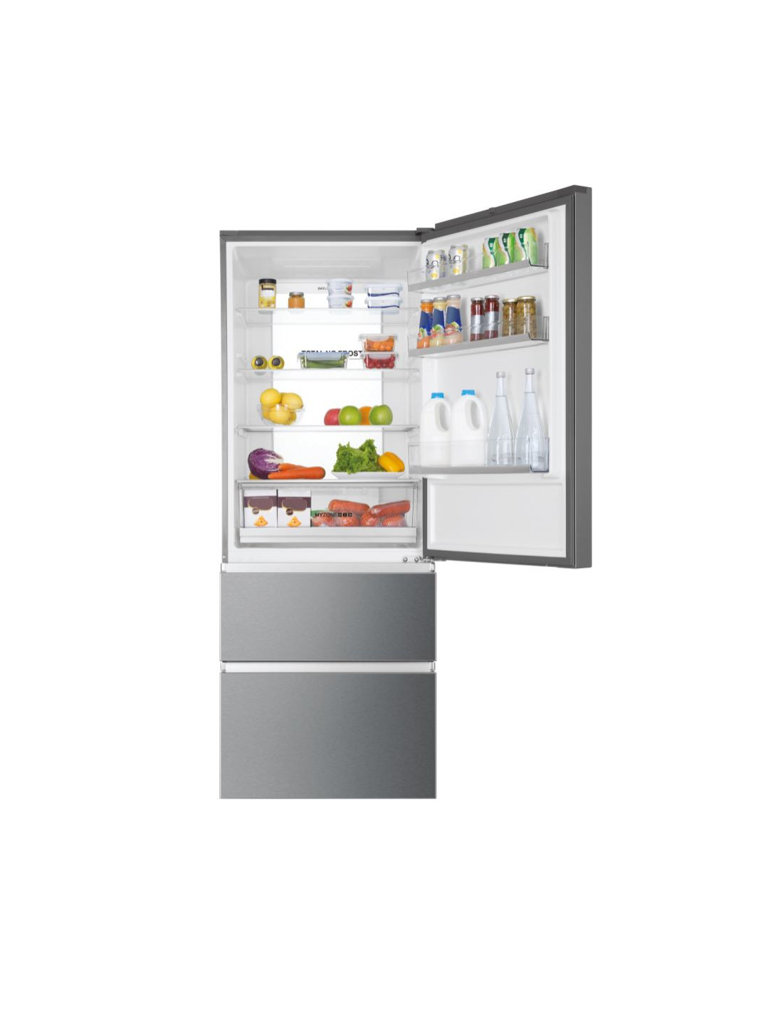 Haier 3D 70 Serie 3 HTOPMNE7193. Capacità netta totale: 450 L. Cerniera porta: Destra. Classe climatica: T, Emissione acustica: 37 dB. Capacità netta frigorifero: 310 L, No Frost (frigorifero), Sistema Multi-Airflow (frigorifero), Luce interna. Capacità netta congelatore: 140 L, Capacità di congelamento: 10 kg/24h, No Frost (congelatore). Compartimento zona fresca. Classe efficienza energetica: E, Consumo energetico annuo: 297 kWh. Colore del prodotto: Platino, Acciaio inox