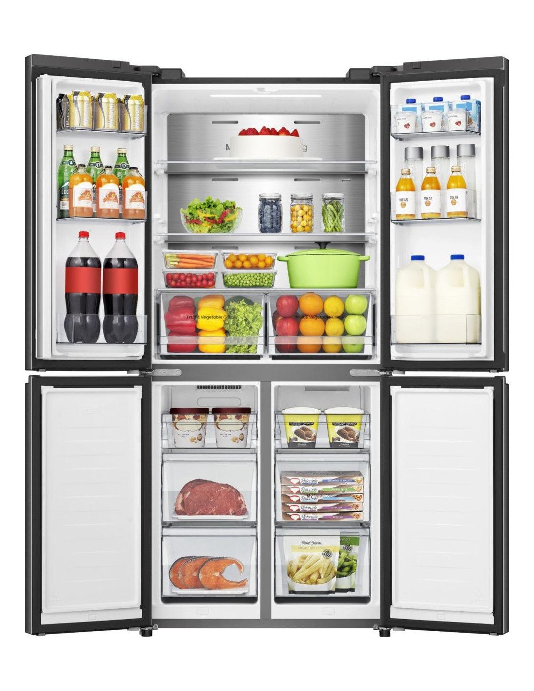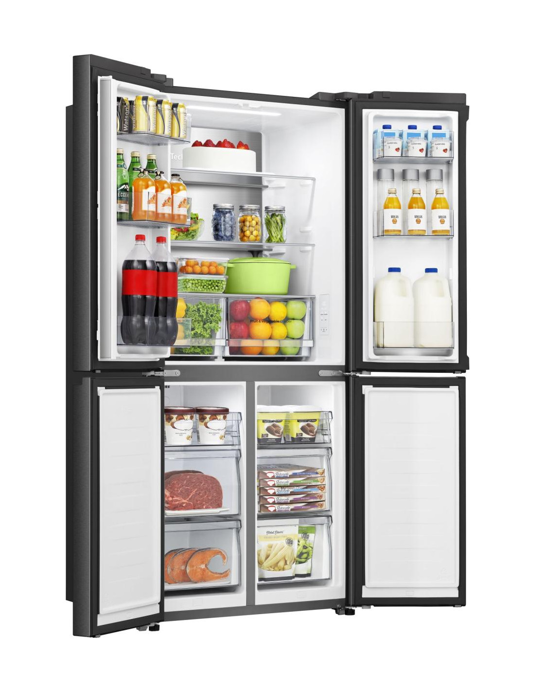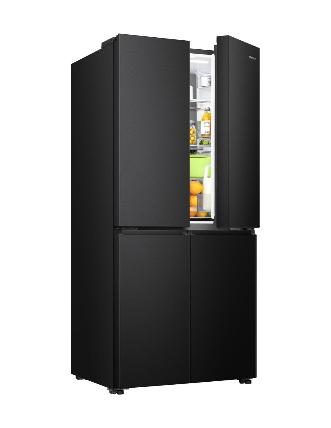 Il frigorifero quattro porte Hisense RQ5P470SAFE, con capienza di 483 litri, sfrutta il sistema Dual-Tech Cooling per mantenere livelli ottimali di umidità e impedire la miscelazione di odori. La tecnologia Total No Frost elimina la formazione di brina, mentre il Multi Air Flow assicura una distribuzione uniforme del freddo, garantendo freschezza e gusto più a lungo.La funzione Super Cool abbassa rapidamente la temperatura per un raffreddamento istantaneo, e la parete interna rivestita in acciaio inox ottimizza la conservazione riducendo condensa e dispersione d’aria fredda. Connettività Wi-Fi e app ConnectLife consentono di regolare temperature e modalità anche da remoto, mentre le quattro porte ad apertura completa e le maniglie integrate rendono il prodotto elegante e funzionale .•Dual Tech Cooling: Il sistema Dual-Tech Cooing garantisce livelli di umidità ideali per un frigorifero senza odori e una freschezza prolungata degli alimenti conservati. Assicurando diversi livelli di umidità nei compartimenti di raffreddamento e congelatore, impedisce qualsiasi miscelazione di odori e mantiene un clima perfetto in ogni parte del frigorifero.