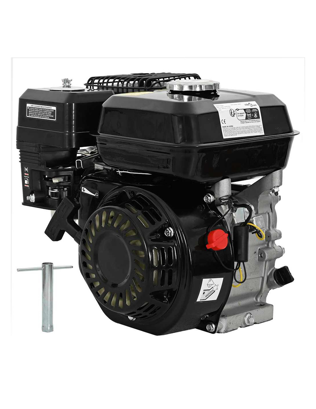 Questo motore a benzina è dotato di un sistema di avviamento "recoil start". Ha un silenziatore per ridurre il rumore. E ha anche un filtro dell'aria molto fine.