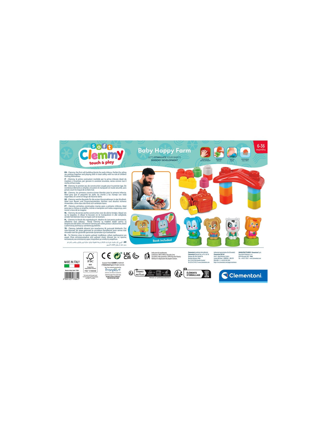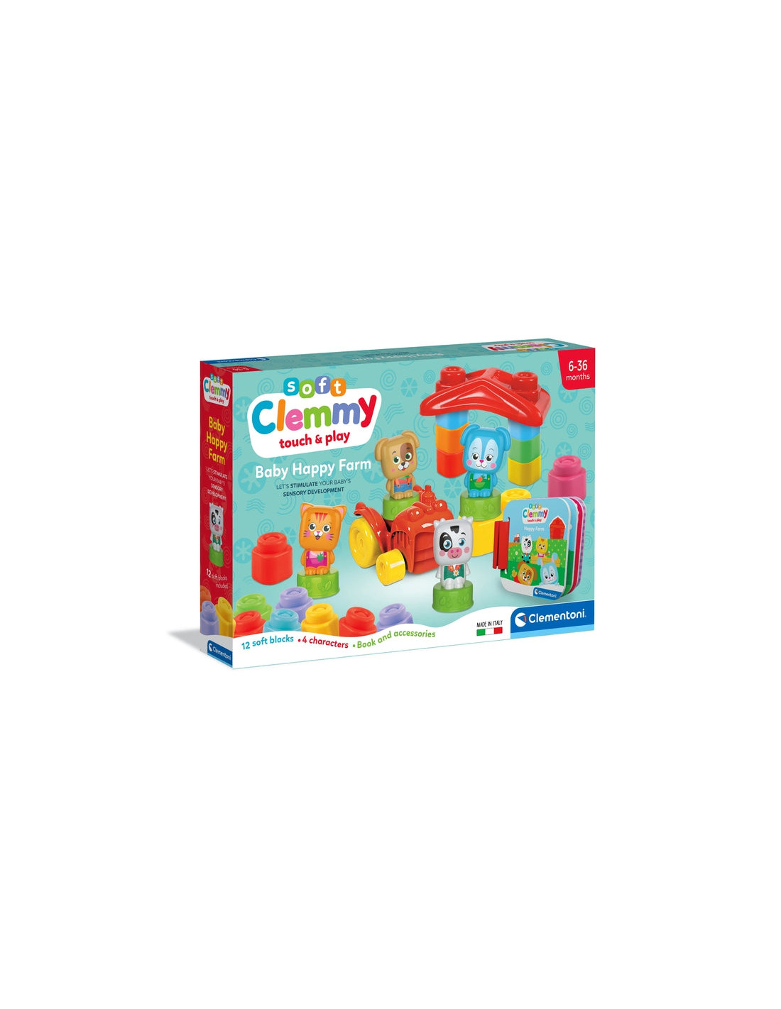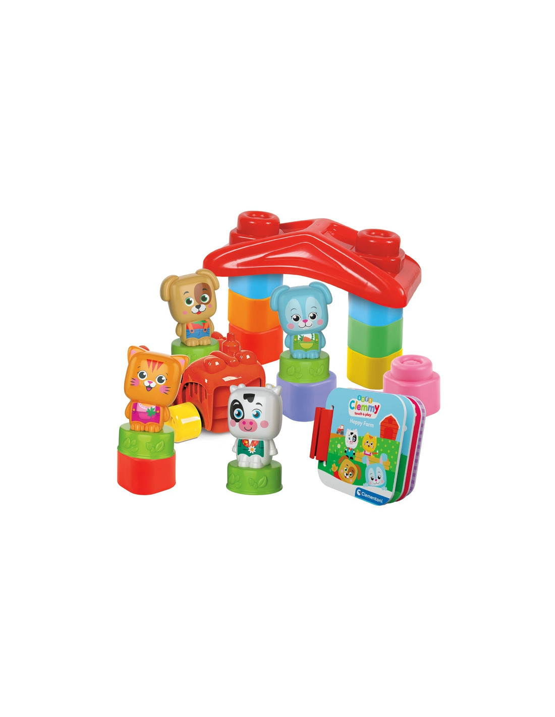 Tanti mattoncini colorati, un trattore e una casetta per rivivere le avventure illustrate nel pratico libro della Clemmy baby happy farm.