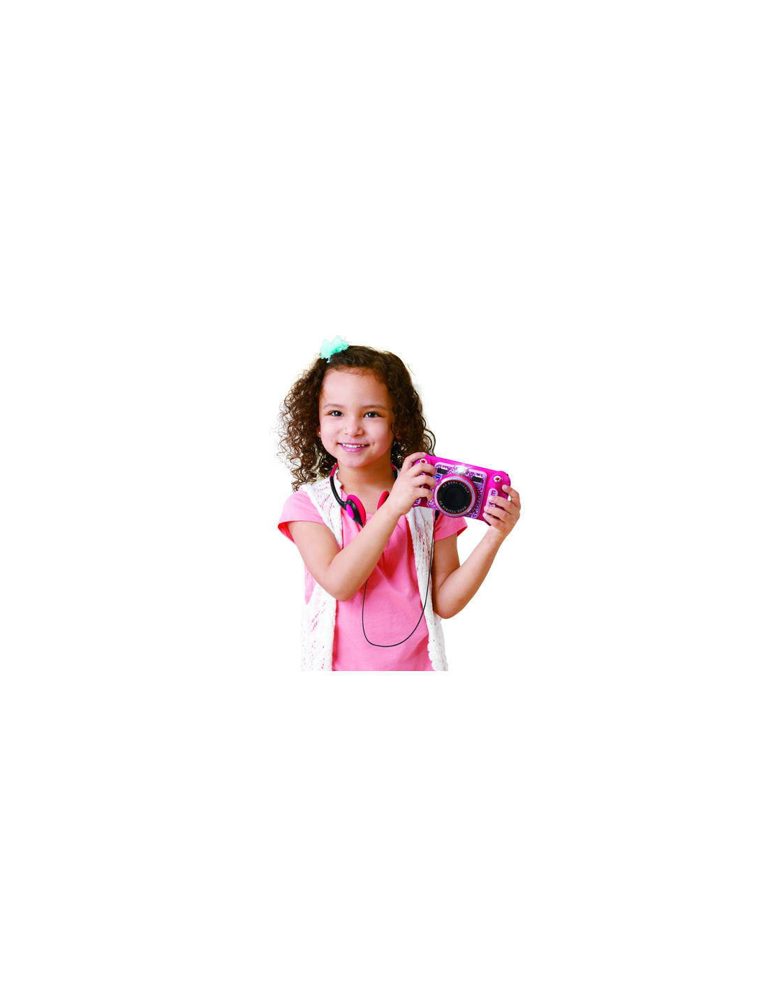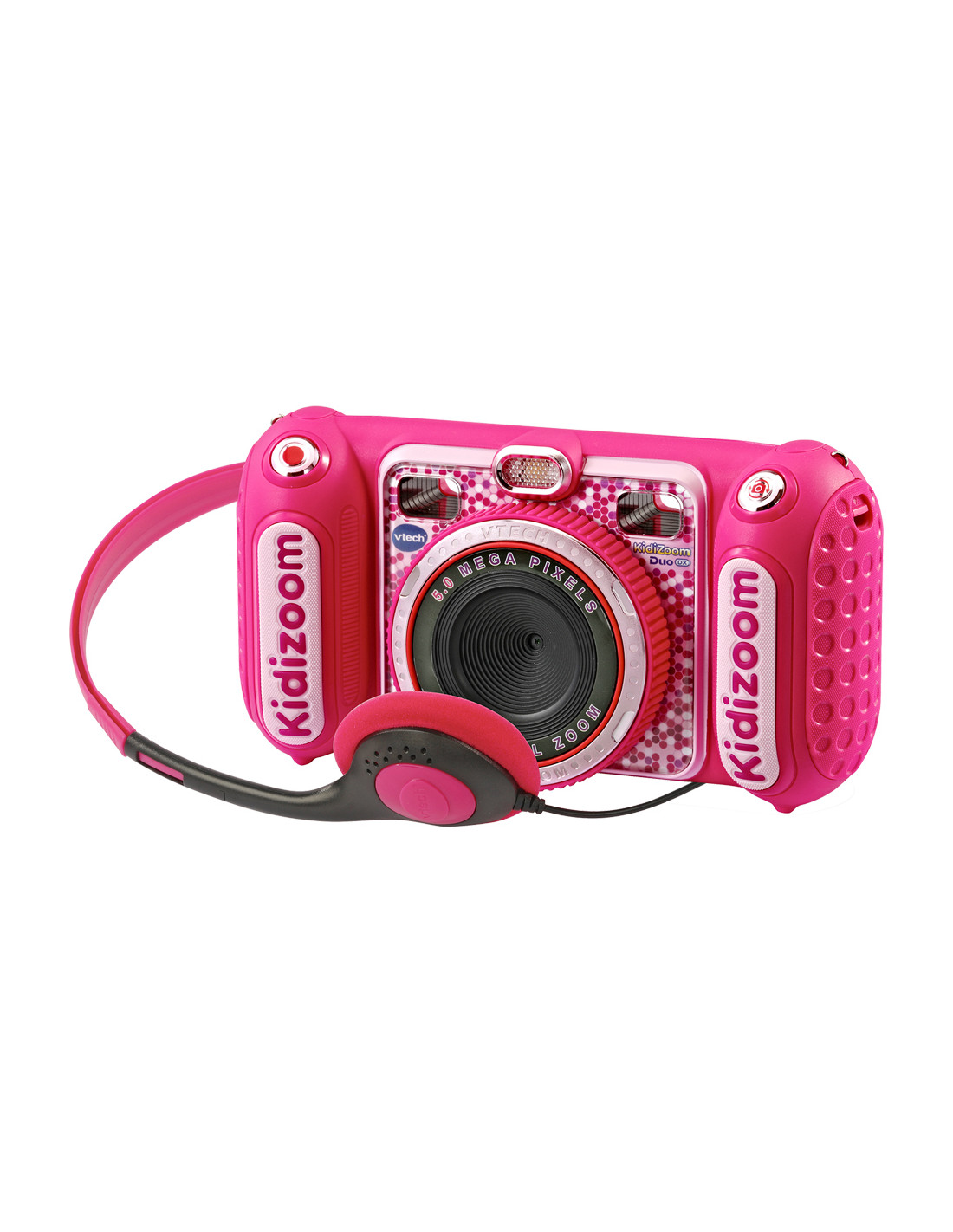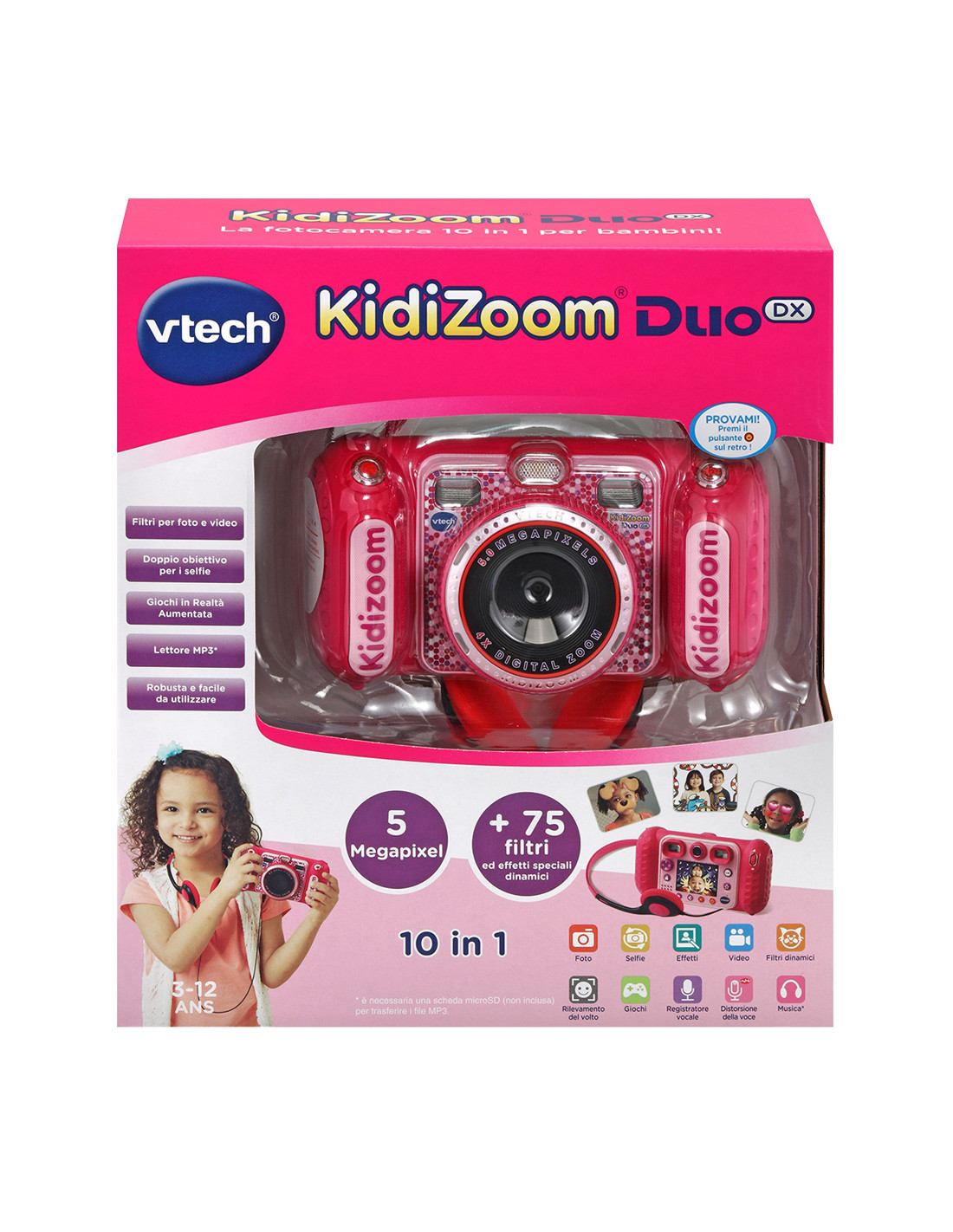 "Scatta, registra e divertiti con la fotocamera digitale Kidizoom Duo DX Rosa! Doppia lente (5 MP frontale e 2 MP posteriore), più di 75 filtri dinamici, 5 giochi in realtà aumentata e funzioni di ritocco foto e video.