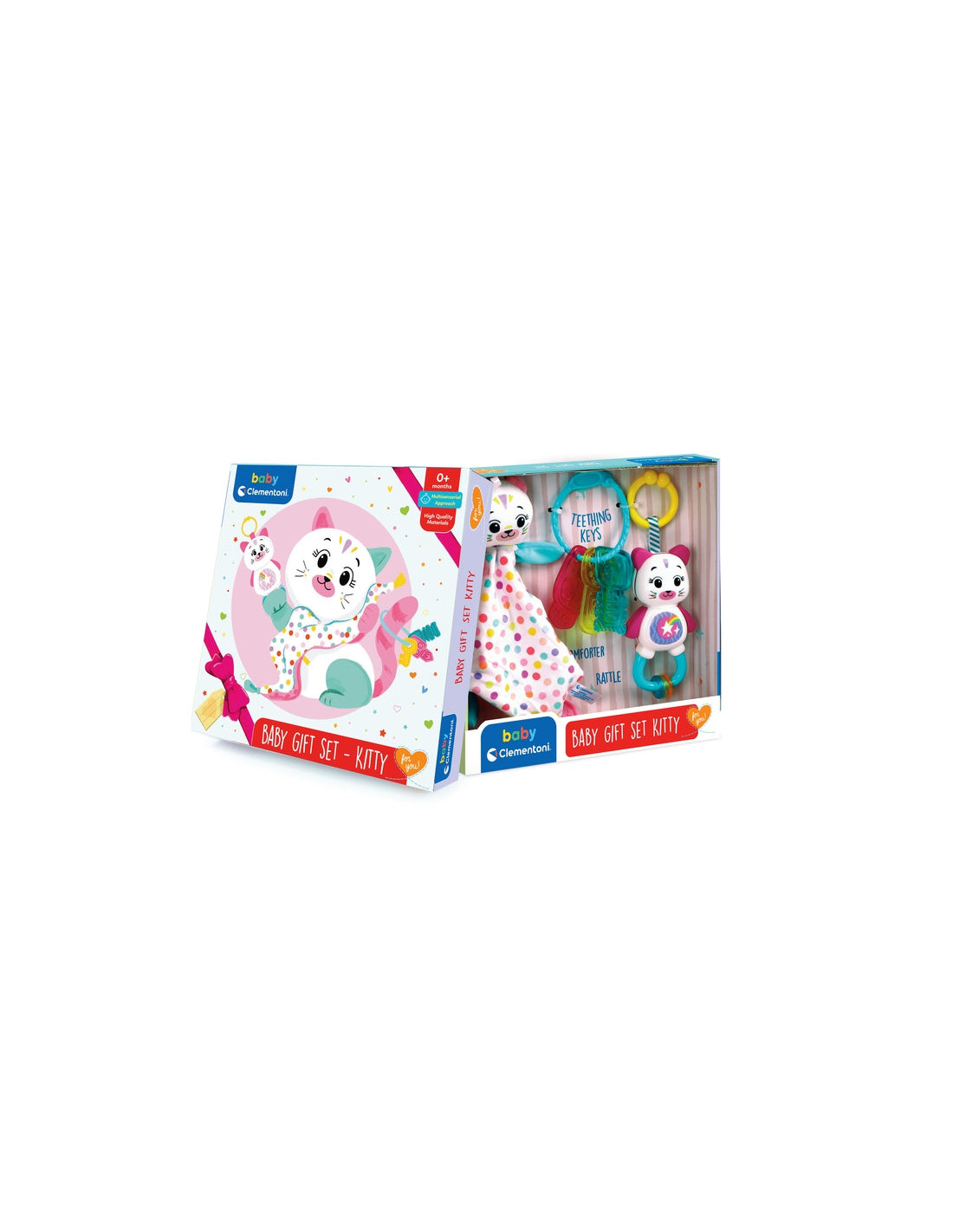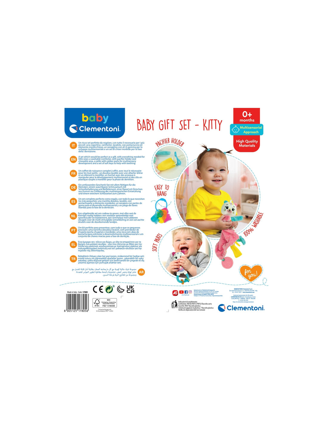 Le chiavi mordicchiose favoriscono lo sviluppo della dentizione, mentre il comforter con le sembianze di una simpatica gattina sarà la prima compagna di giochi dei bambini.