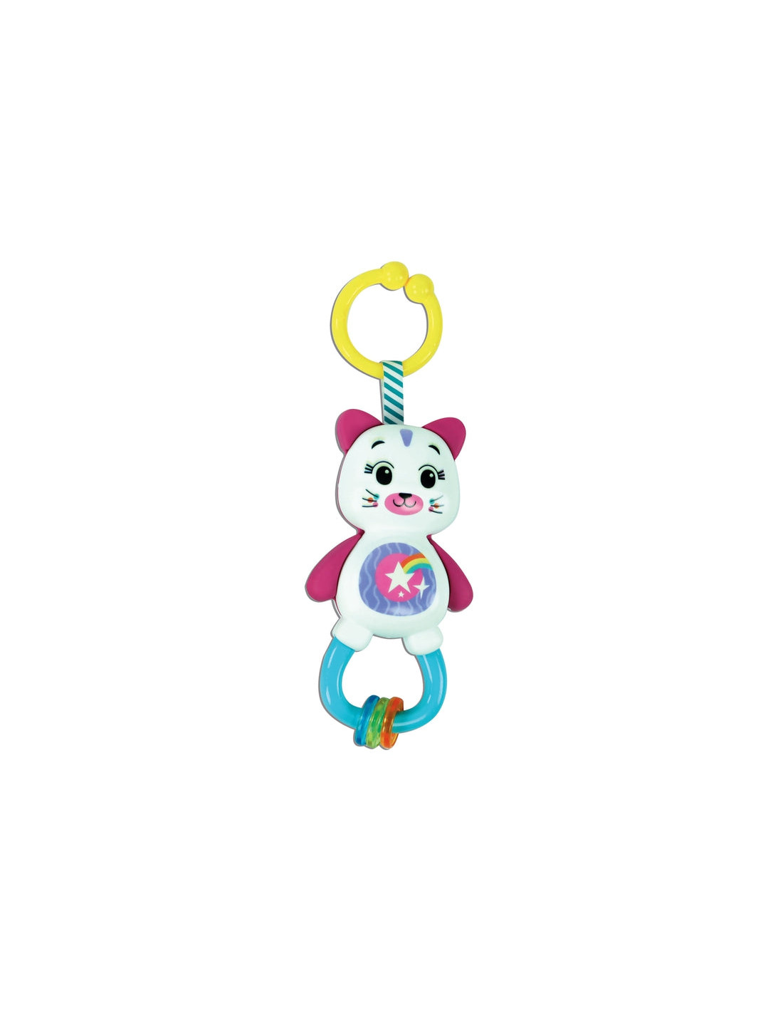 Un colorato rattle con le sembianze di una dolcissima gattina, ricco di elementi in gomma morbida e sicura e un comodo anello per appenderlo.