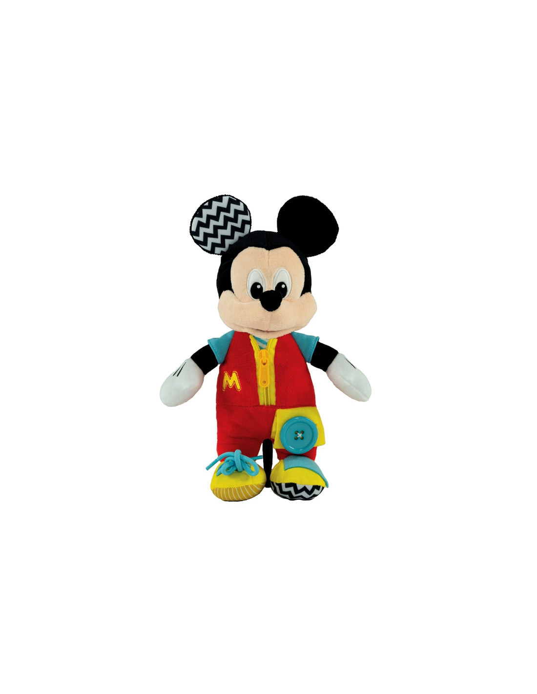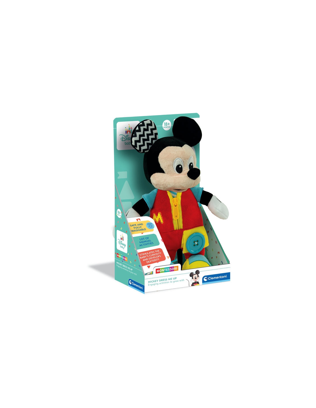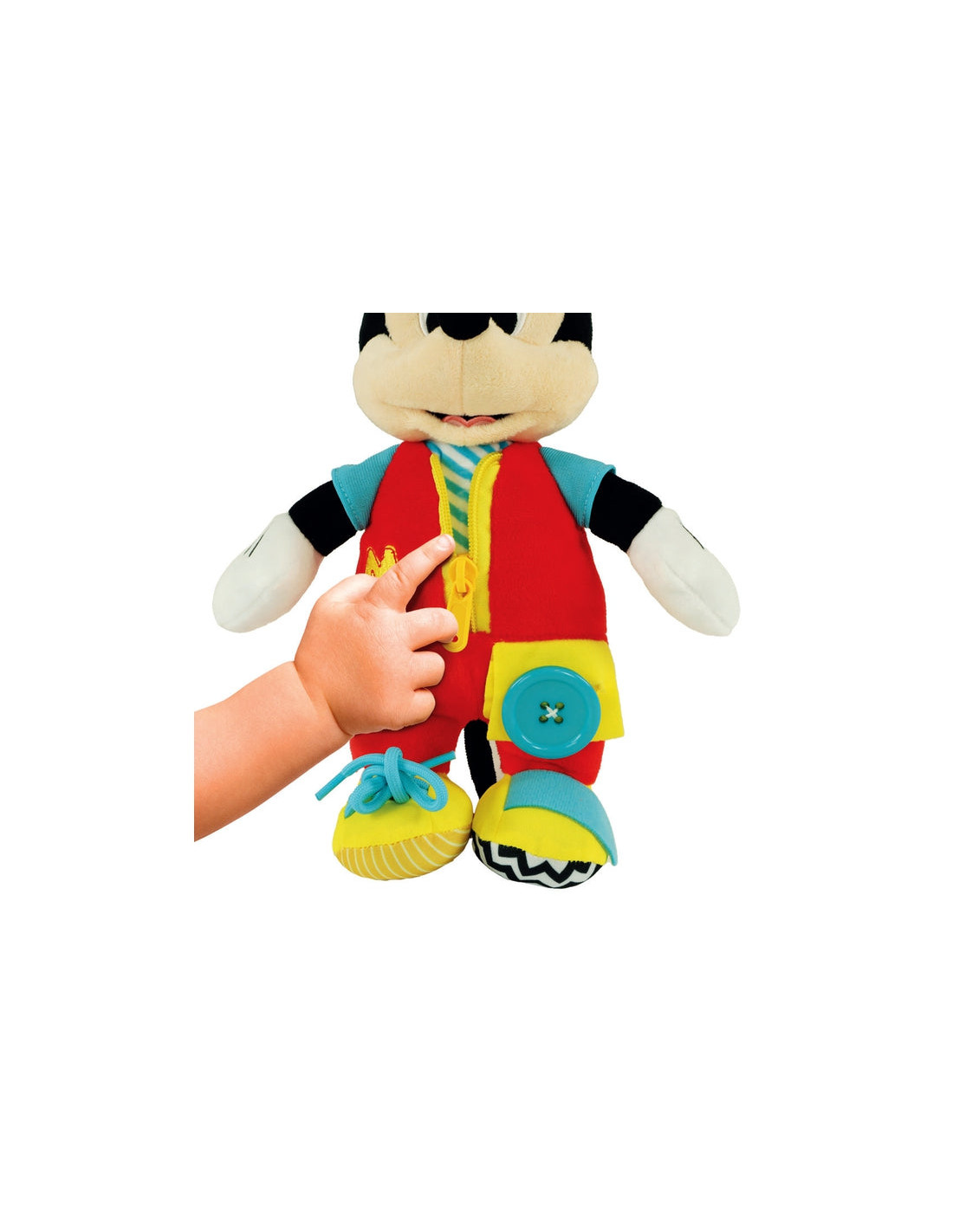 Il simpatico peluche di Baby Mickey, con tante dinamiche di gioco legate alla quotidianità del bambino, per sperimentare ed esercitare le abilità manuali, per imparare a fare da solo nell'azione del vestirsi.