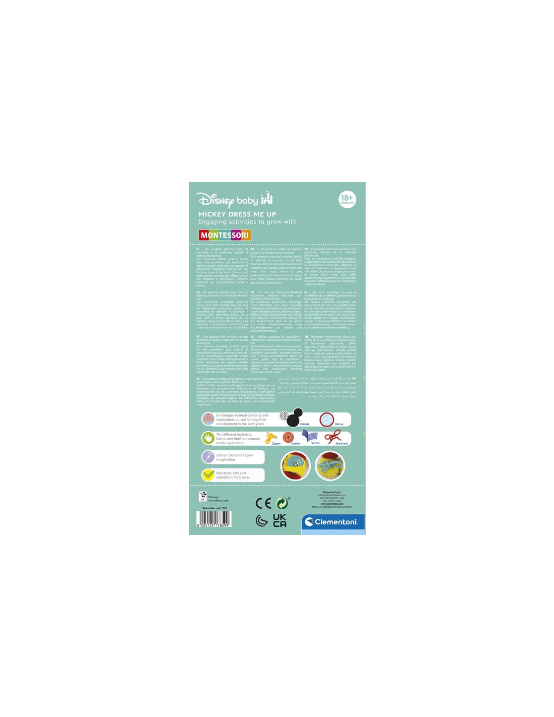 Il peluche di Baby Mickey viene proposto con un design ricercato, colorato, con diversi materiali e funzioni, per stimolare la sensorialità.