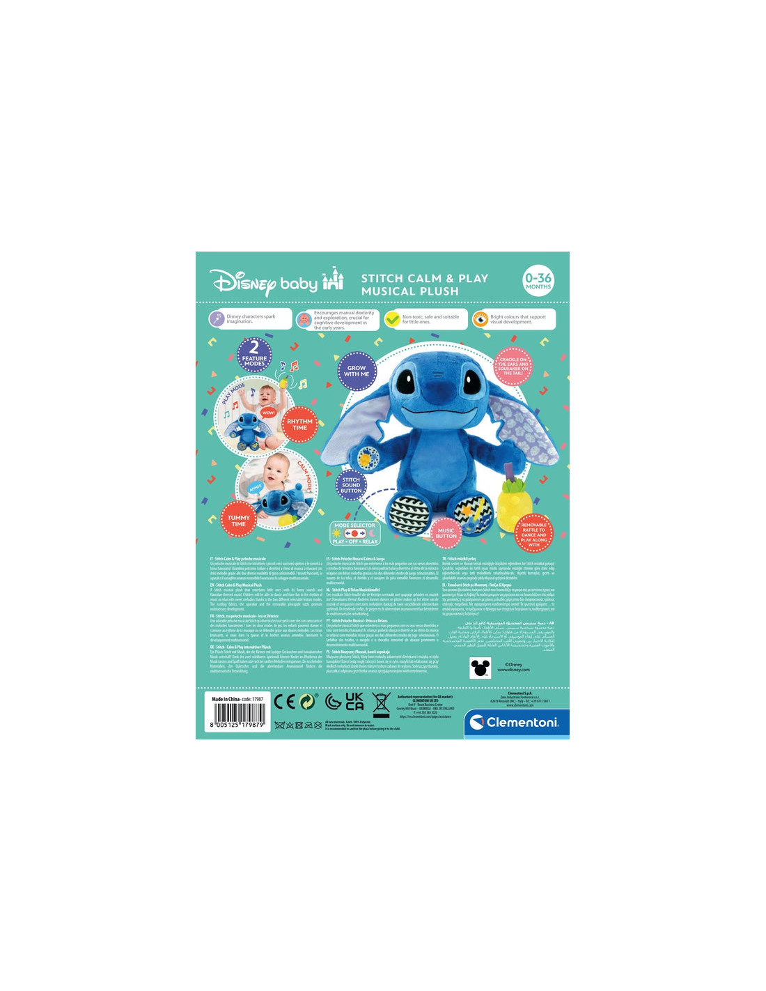 Il bambino potrà rilassarsi con dolci ninna nanne; oppure ballare al ritmo di divertenti melodie hawaiane suonando il sonaglino ananas.