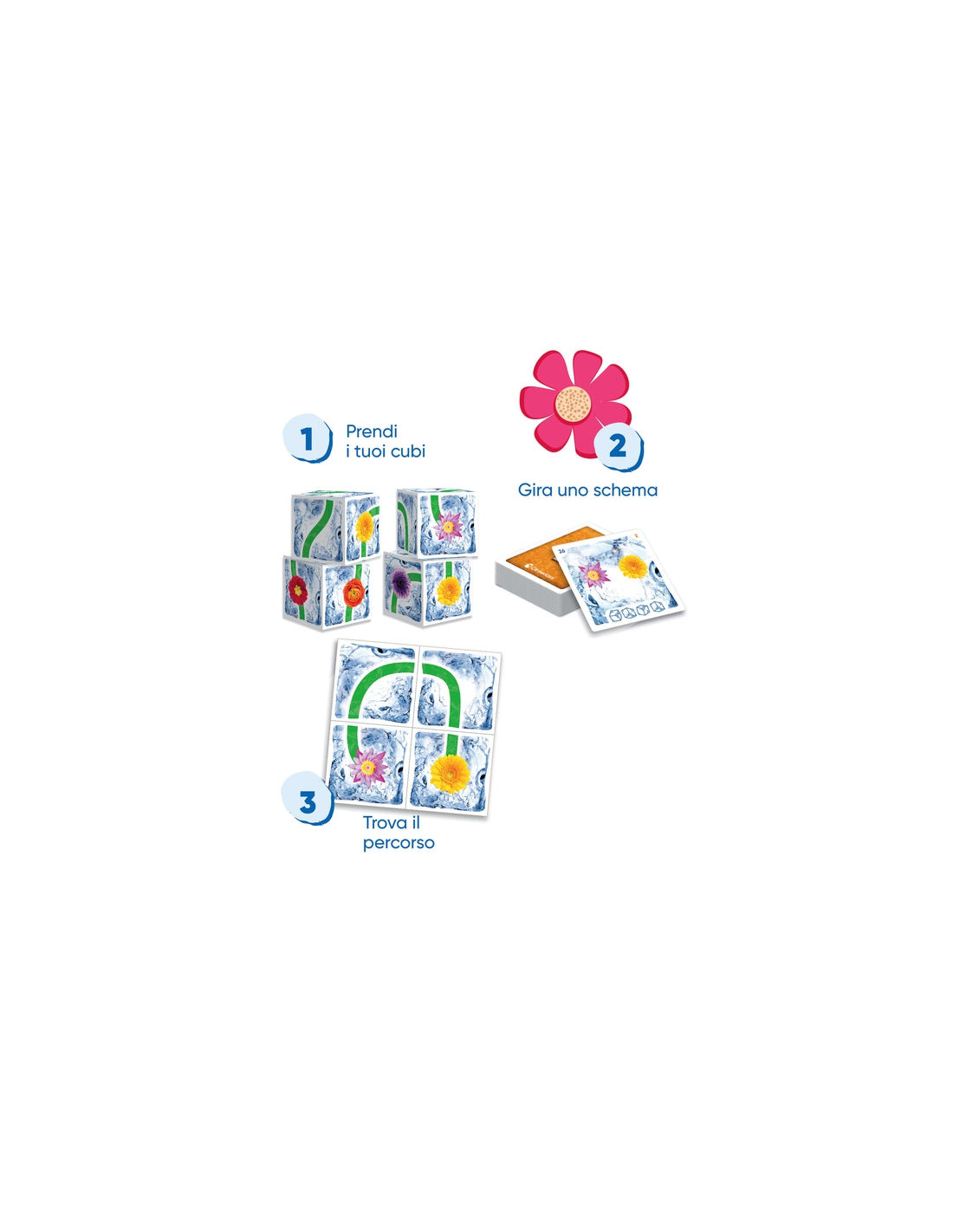 Il giocatore che compone con i cubi il percorso che collega gli elementi presenti sulla carta, conquista il punto. Vince che ne fa di più.