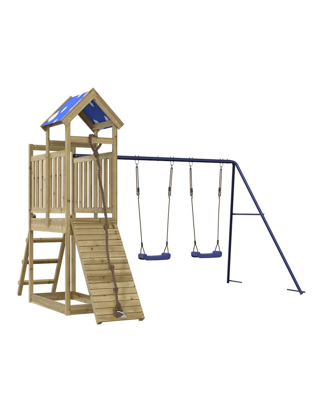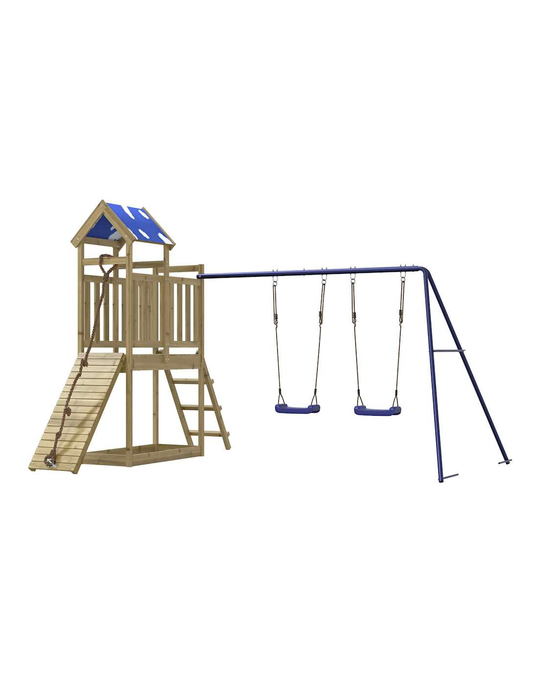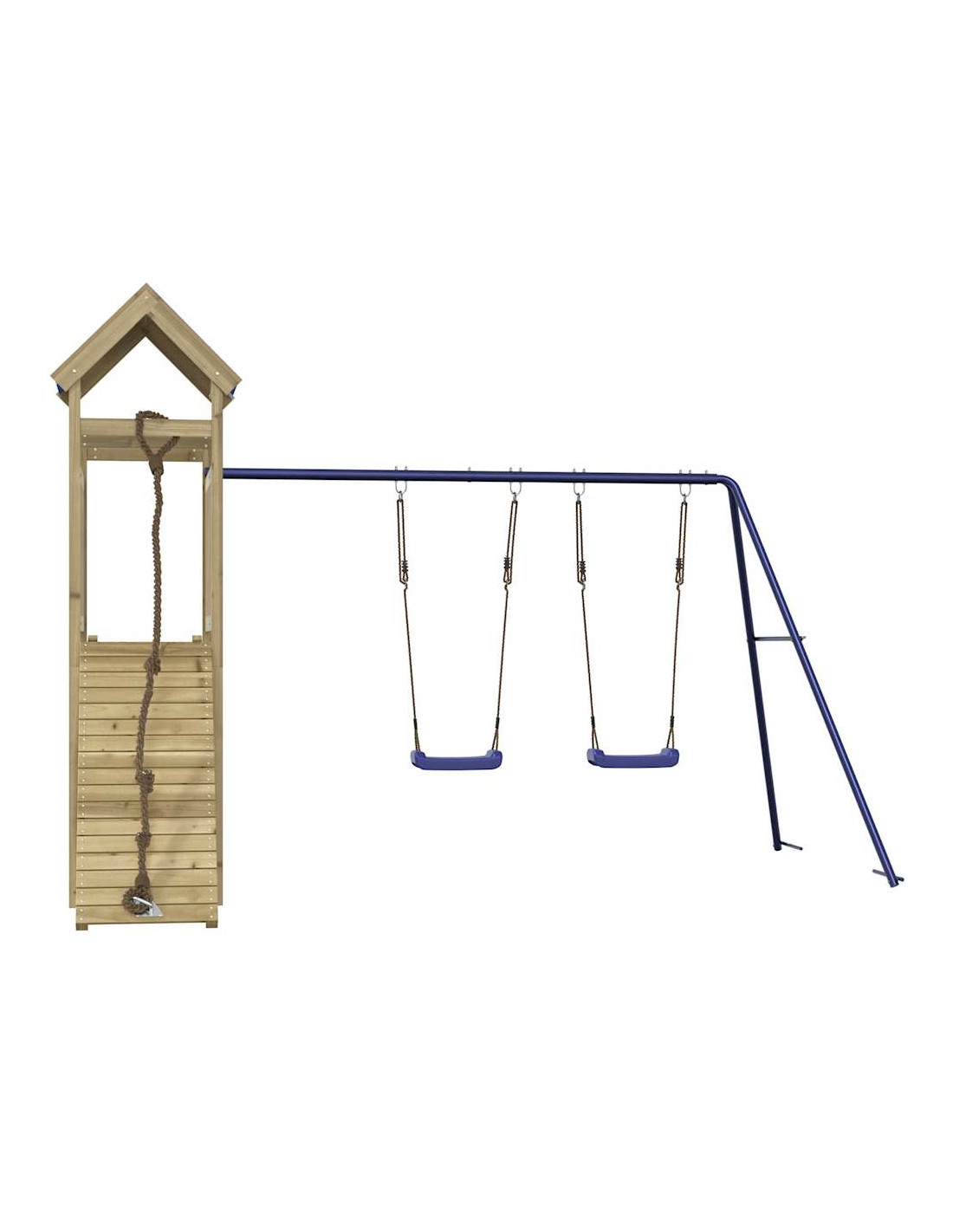 - Telaio robusto in legno: La struttura in legno della casetta da giardino garantisce robustezza e stabilità. Inoltre, le gambe a forma di "A" dell'altalena per bambini consentono l'equilibrio.