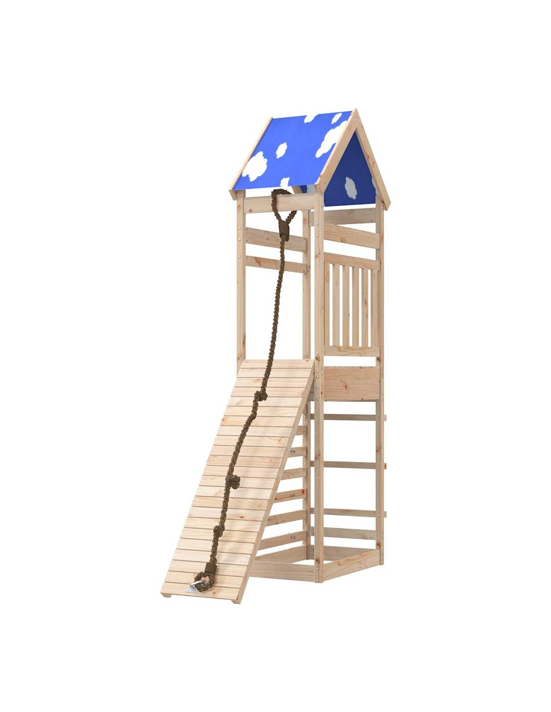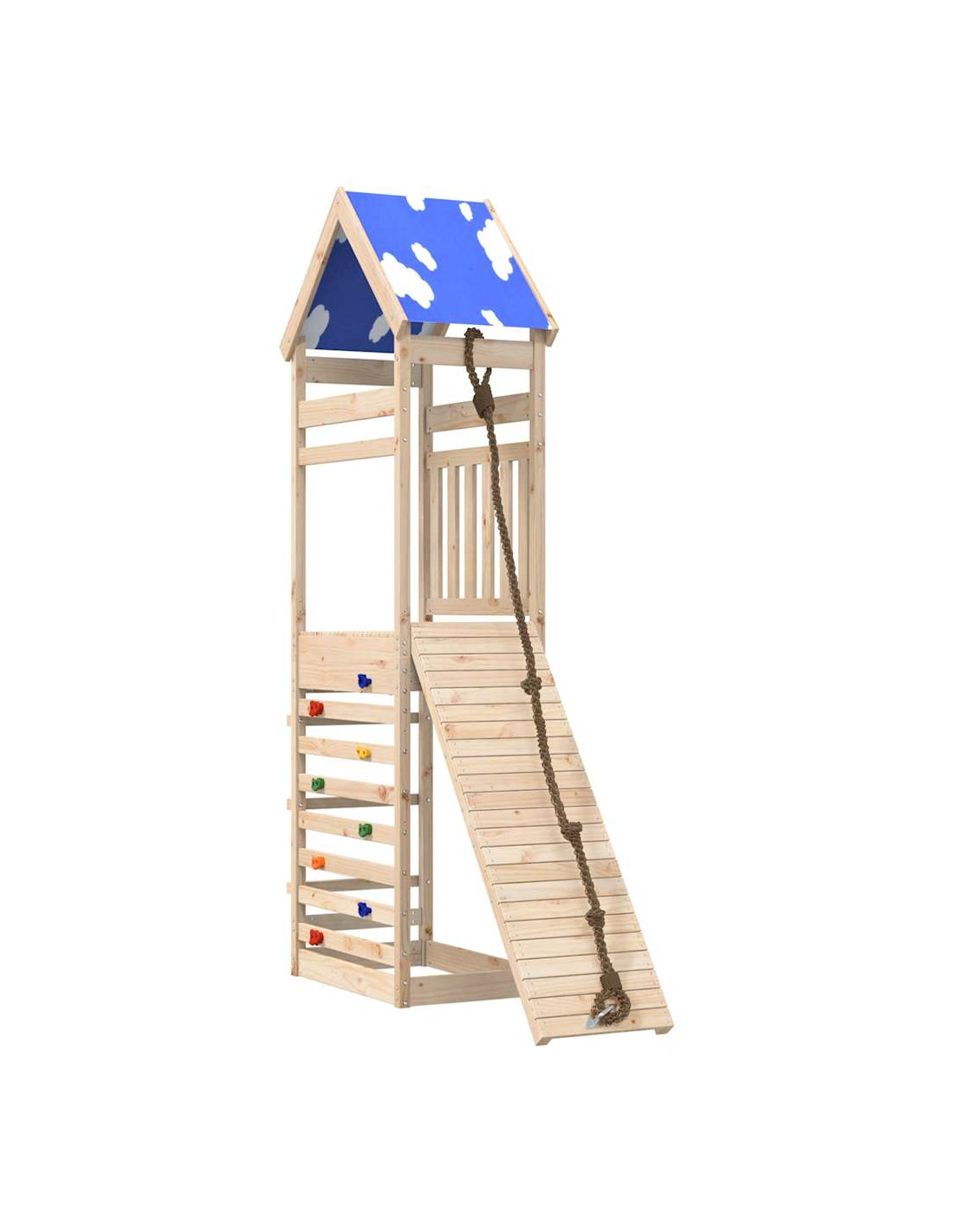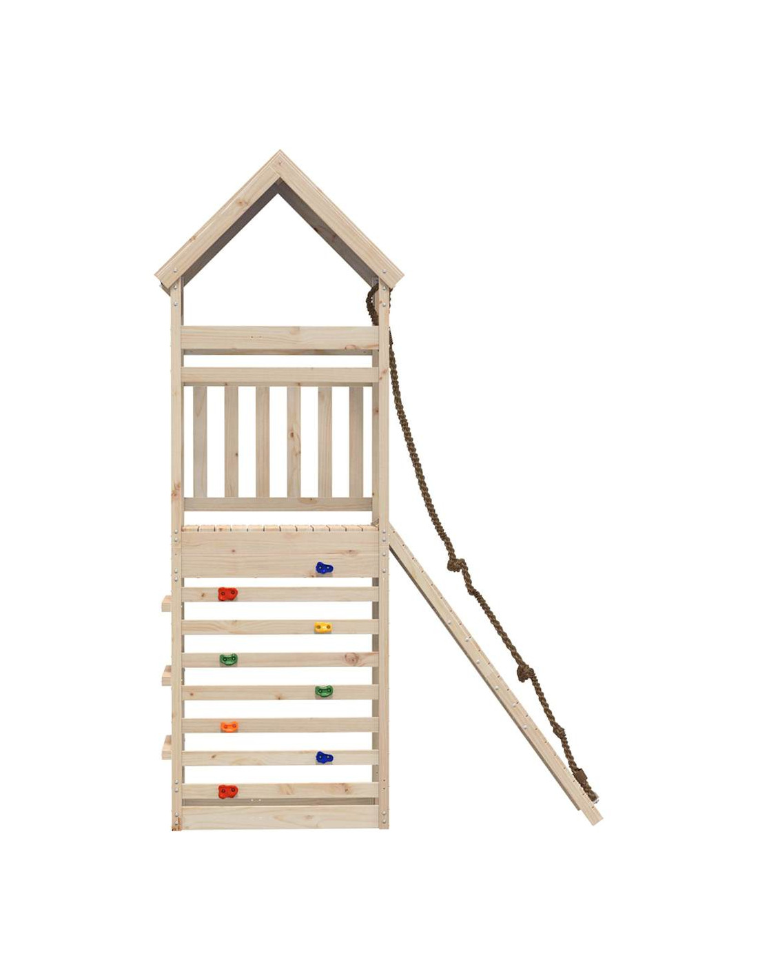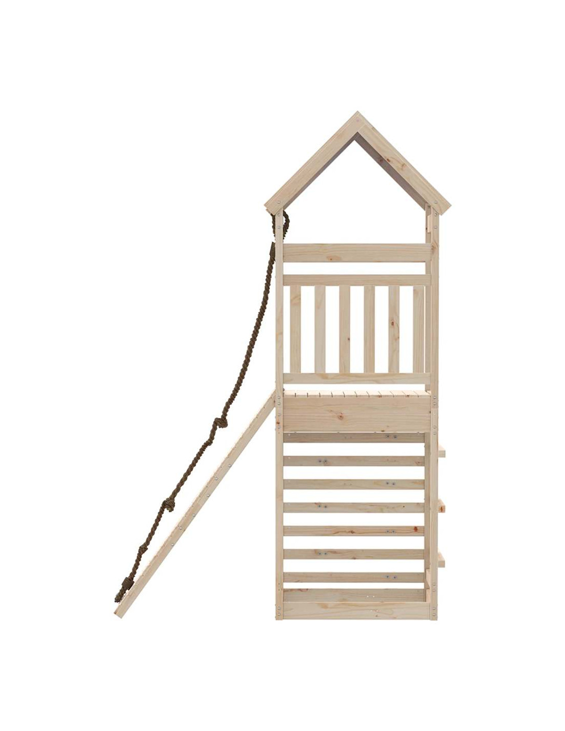 - Materiale resistente: Questo parco giochi è realizzato in legno massello di pino. Il legno massello di pino è noto per la sua resistenza e durata. Le sue venature dritte e i suoi nodi caratteristici contribuiscono al suo fascino rustico.