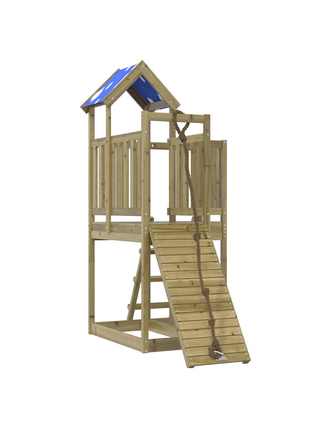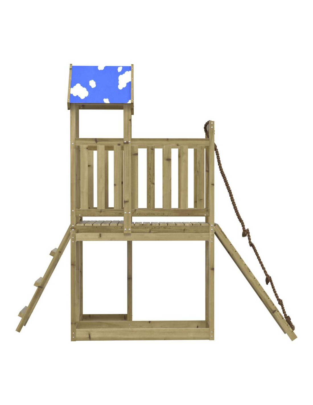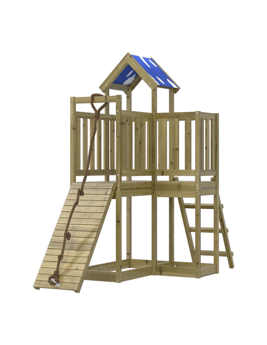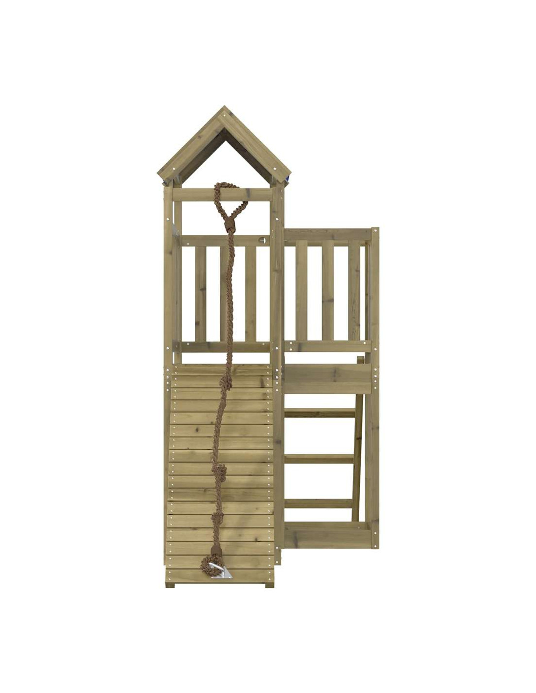- Materiale resistente: Questo parco giochi è realizzato in legno di pino impregnato sottovuoto. Il legno massello di pino è noto per la sua resistenza e durata. Le sue venature dritte e i suoi nodi caratteristici contribuiscono al suo fascino rustico. È stato impregnato con una soluzione conservatrice e sottoposto a trattamento in autoclave, migliorandone la resistenza al decadimento e agli agenti atmosferici.