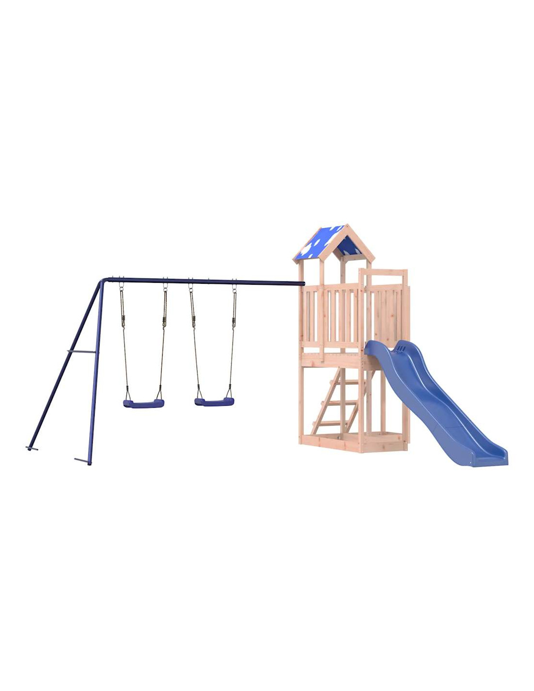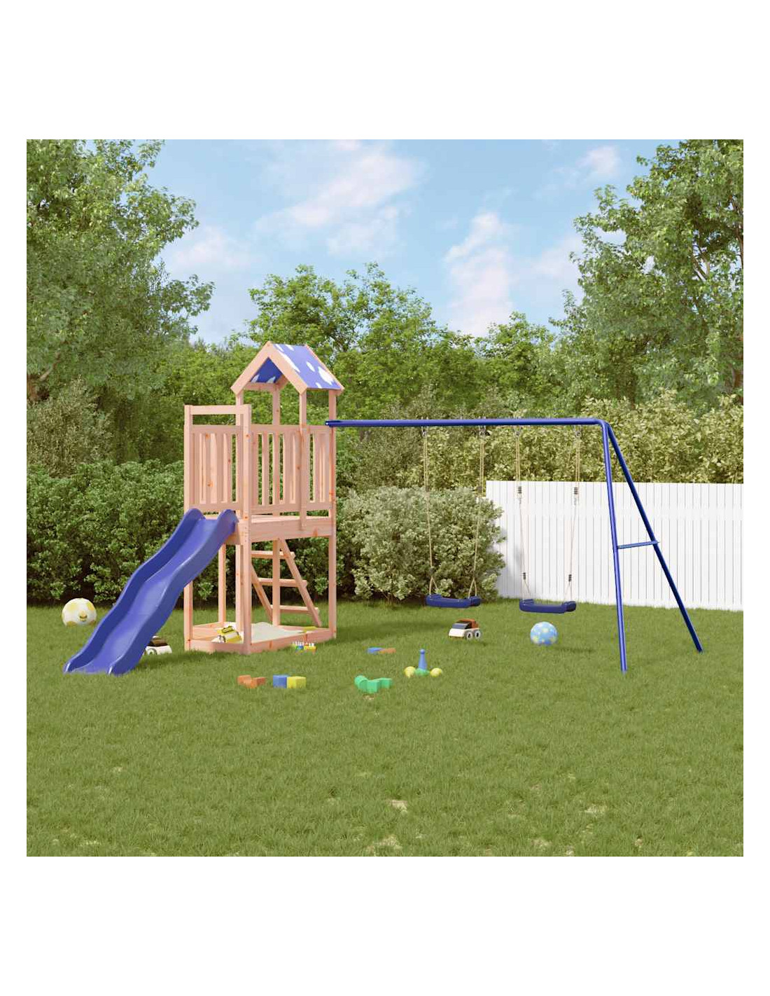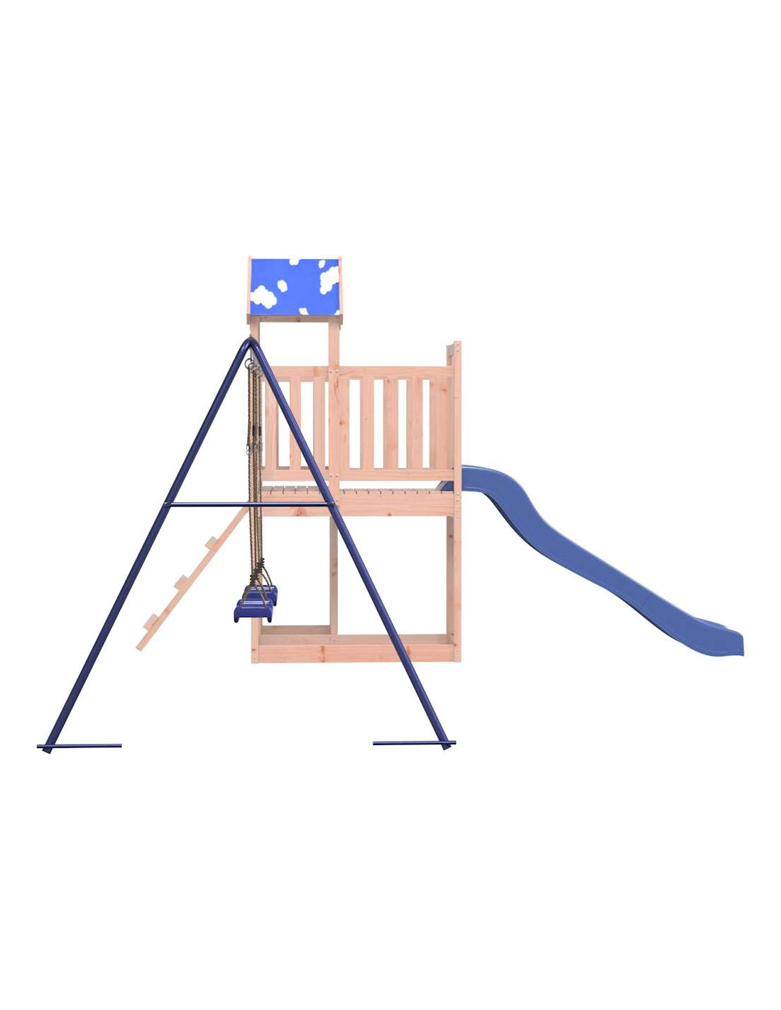 Volete dare ai vostri figli la libertà di giocare a casa? Questo set da gioco per esterni in legno trasforma il vostro cortile in un parco giochi per avventure fantasiose! Materiale durevole: Questo parco giochi da giardino è realizzato in legno massello di douglas. Il legno massello di douglas è noto per la sua resistenza e durata. Il suo colore ricco bruno-rossastro e le sue venature uniche emanano un'atmosfera calda e naturale. Con una buona stabilità e resistenza agli agenti atmosferici, è ideale per la realizzazione di mobili per ambienti interni ed esterni.Telaio robusto in legno: La struttura in legno della casetta da giardino garantisce robustezza e stabilità. Inoltre, le gambe a forma di "A" dell'altalena per bambini consentono l'equilibrio.Centri multiattività: Il parco giochi è dotato di una piattaforma di 90 cm di altezza e si distingue per lo scivolo ondulato, un set di 2 altalene, una scaletta e sabbiere. I vostri piccoli possono anche invitare i loro amici a unirsi al divertimento.Design accurato: le ringhiere in legno circostanti sono progettate per garantire la sicurezza dei bambini durante il loro gioco felice. Inoltre, il tetto con le nuvole offre ombra ai vostri bambini nelle calde giornate estive.Divertimento senza fine: Questo divertente set da gioco da esterno in legno è il modo perfetto per far divertire i vostri bambini e i loro amici, per avere più tempo interattivo e per creare ricordi per voi e i vostri bambini! Avvertenza:Solo per uso domesticoUso esternoNon adatta per bambini di età inferiore ai 3 anniEtà consigliata: 3-8 anni