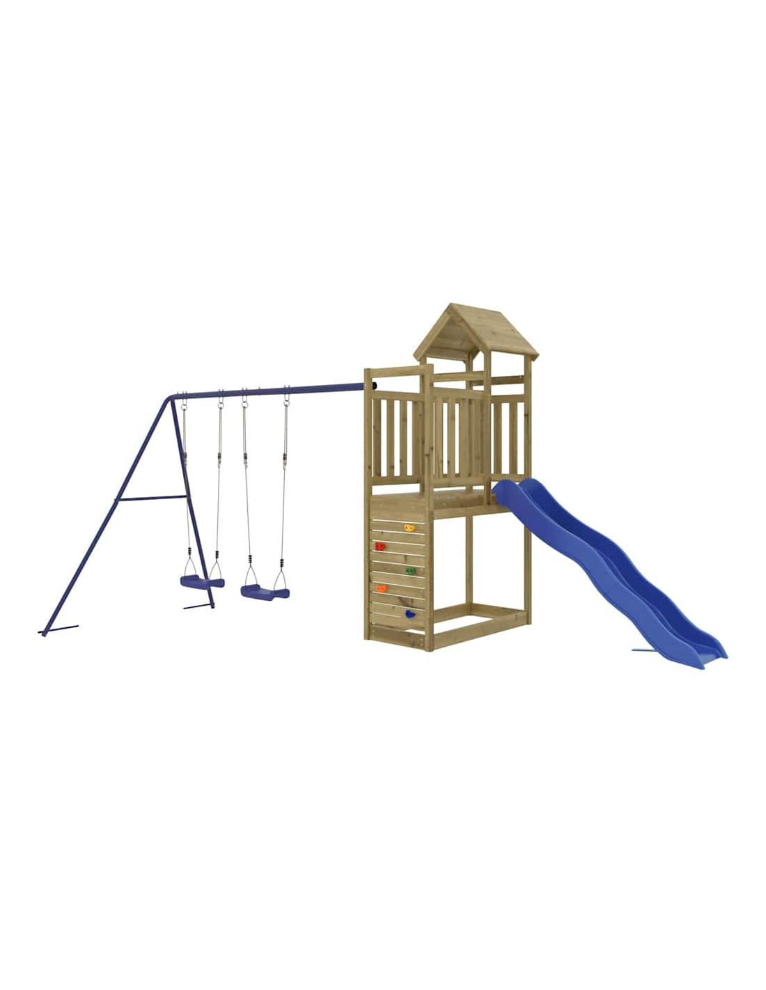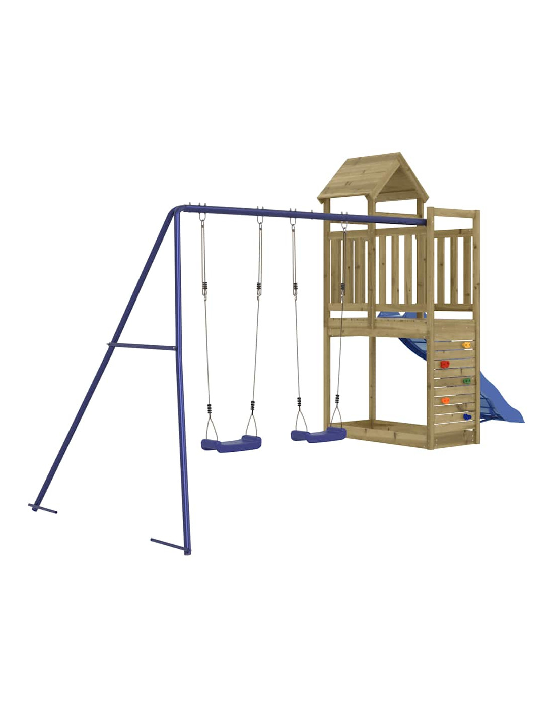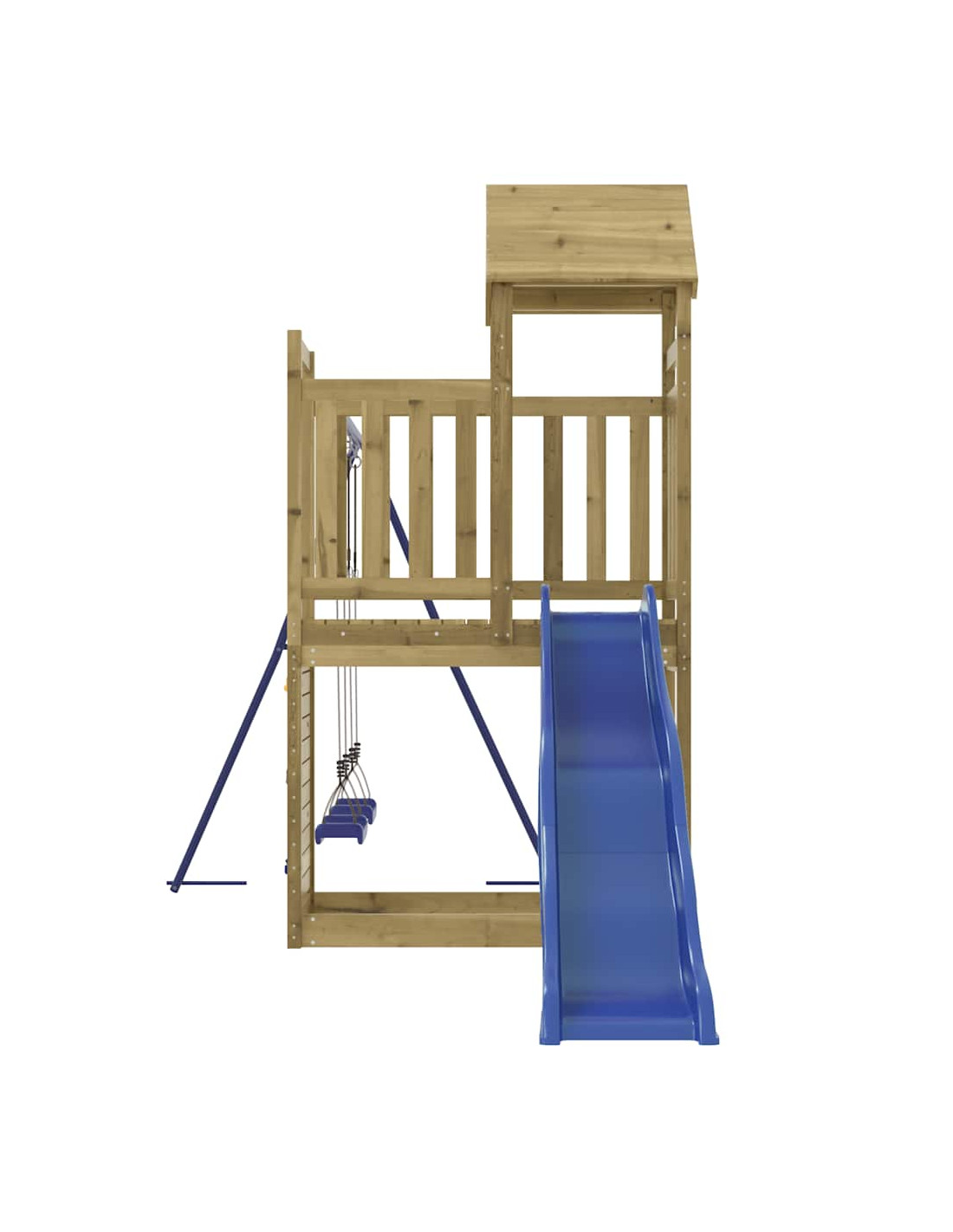 - Materiale resistente: questo parco giochi da giardino è realizzato in legno di pino impregnato sottovuoto. Il legno massello di pino è un bellissimo materiale naturale. Il legno di pino ha le venature dritte e i nodi conferiscono al materiale il suo caratteristico aspetto rustico. L'impregnazione è un processo di conservazione eseguito utilizzando le autoclavi. Il trattamento a pressione aumenta la resistenza alla decomposizione e agli agenti atmosferici.