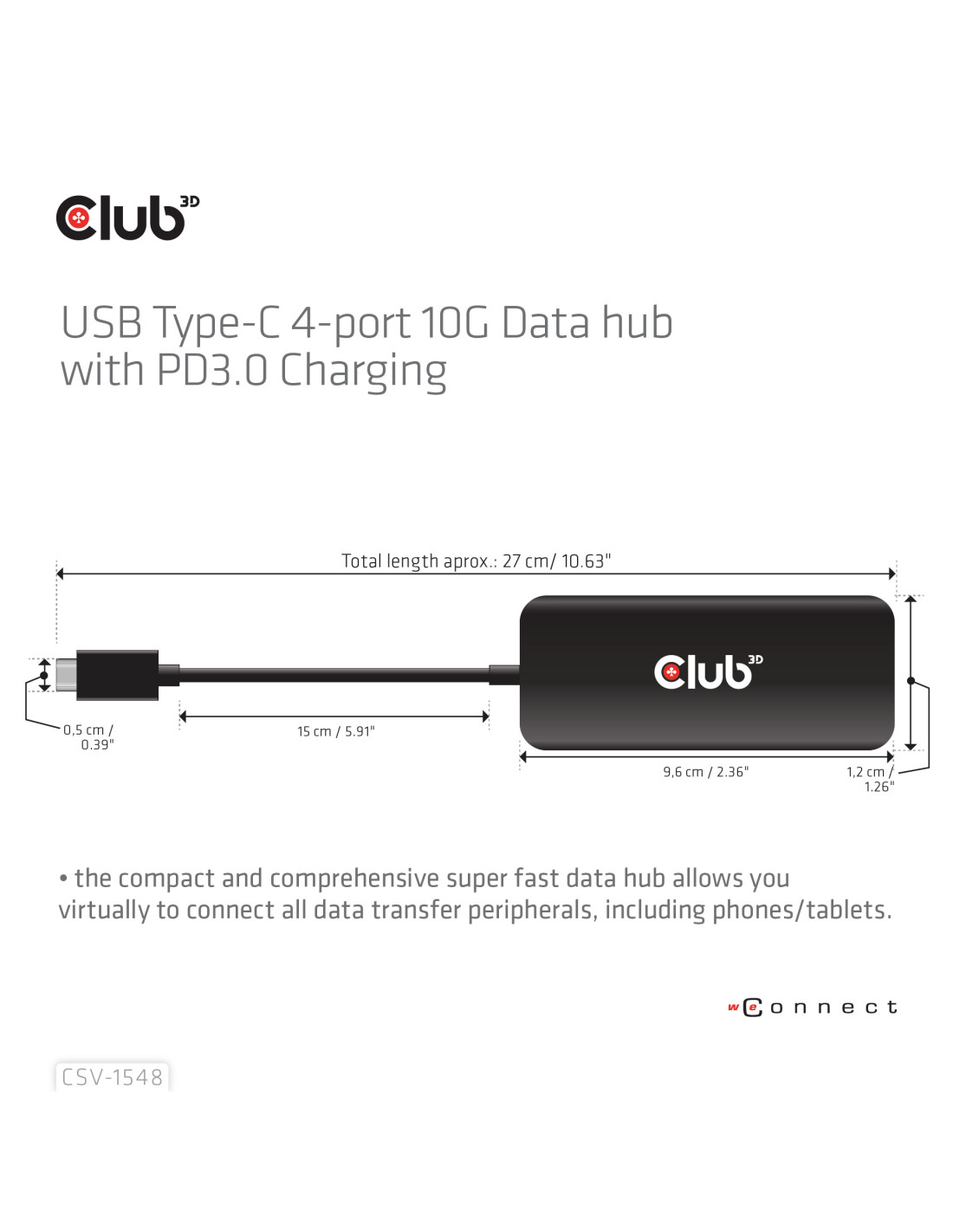 CLUB3D CSV-1548. Tecnologia di connessione: Cablato, Interfaccia host: USB 3.2 Gen 1 (3.1 Gen 1) Type-C, Fornitura di alimentazione USB fino a: 100 W. Colore del prodotto: Nero, Velocità di trasferimento dati: 10 Gbit/s. Tipologia alimentazione: USB, Lunghezza cavo USB: 0,18 m. Larghezza: 95 mm, Profondità: 38 mm, Altezza: 10 mm. Quantità per pacco: 1 pz, Larghezza imballo: 60 mm, Profondità imballo: 182 mm