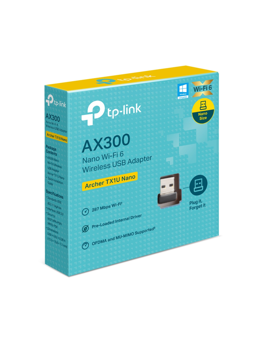 TP-Link AX300. Tecnologia di connessione: Wireless, Interfaccia host: USB, Interfaccia: WLAN. Velocità massima di trasferimento dati: 287 Mbit/s, Wi-Fi standard: Wi-Fi 6 (802.11ax), Banda Wi-Fi: Banda singola (2.4 GHz). Alimentazione USB. Colore del prodotto: Nero