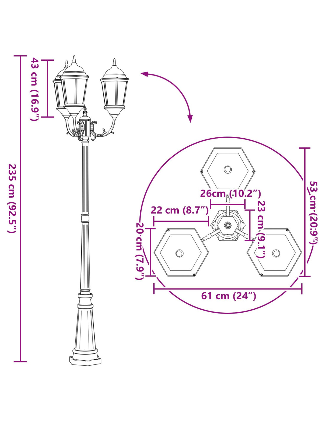 - Funzioni /Design: Con un'estetica vintage, questa luce da giardino si adatta perfettamente agli stili nostalgici all'aperto. È progettata per distribuire la luce in modo ottimale e per essere energetica, con una potenza di 300W. Il suo stile crea un'atmosfera accogliente, rendendo incantevoli le serate e le passeggiate notturne.