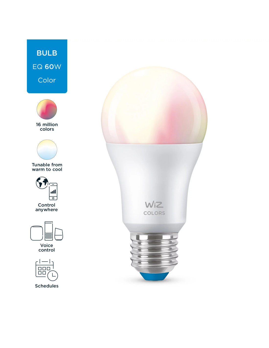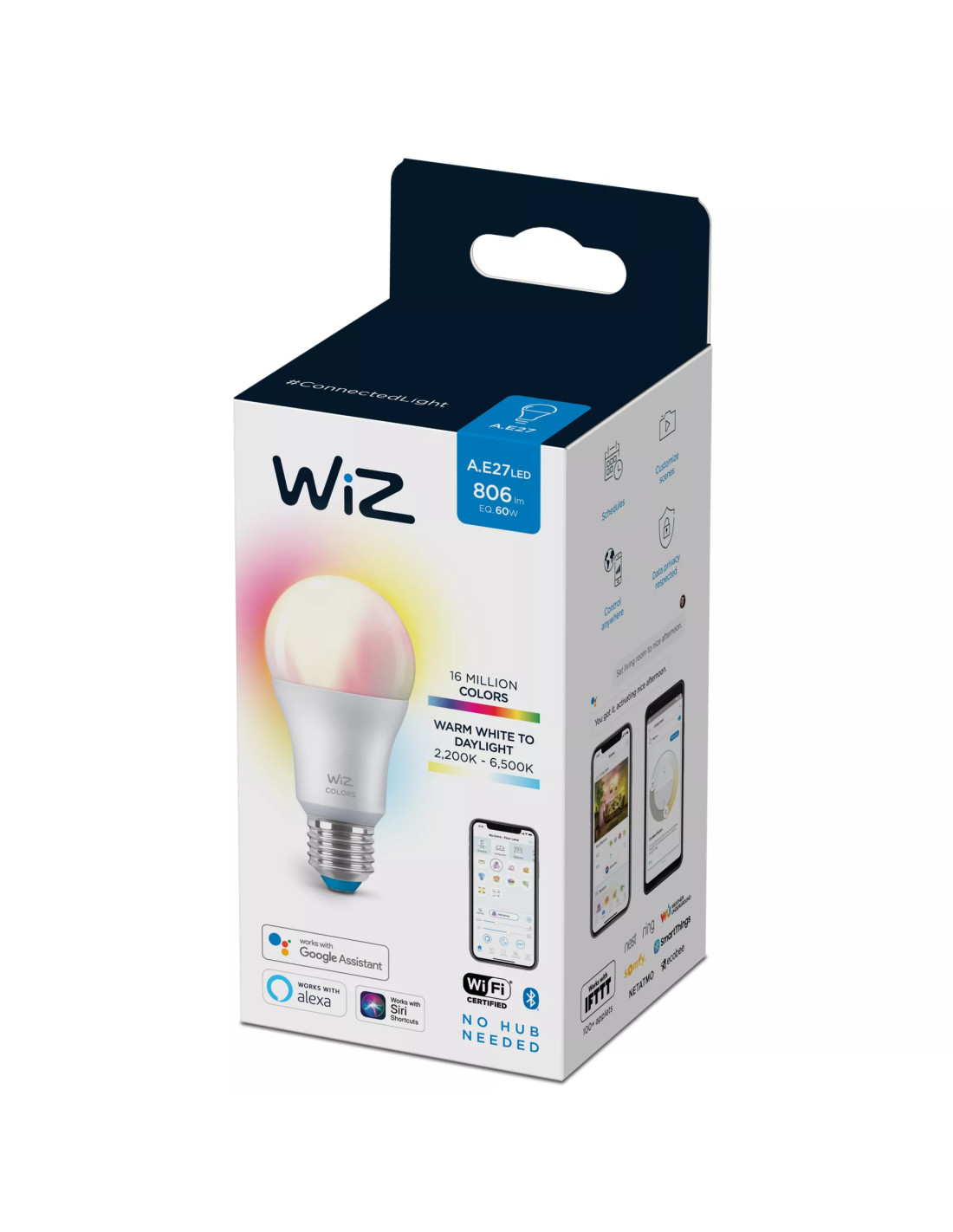 La lampadina colorata WiZ LED A60 offre un'illuminazione smart per i tuoi momenti quotidiani. Si adatta a qualsiasi paralume per creare l'atmosfera che desideri grazie a 16 milioni di colori, oltre che alla luce bianca che puoi trasformare da fredda a calda. Puoi programmare le luci affinché si accendano e si spengano in base alle tue abitudini quotidiane e settimanali, controllarle con lo smartphone o con la tua voce e avere accesso da remoto alle luci anche quando non ci sei. Le luci WiZ si connettono al tuo router Wi-Fi esistente e non richiedono alcun hardware aggiuntivo.