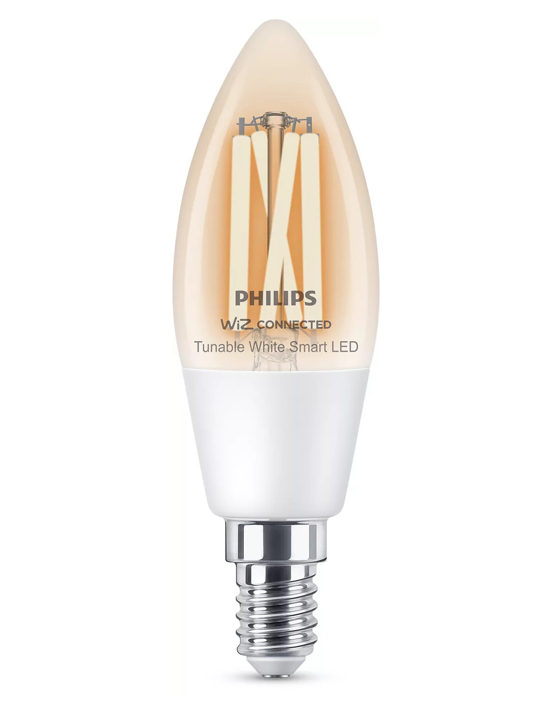Philips LED Lampadina Smart Filament Dimmerabile Luce Bianca da Calda a Fredda Attacco E14 40W Candela. Tipo: Lampadina intelligente, Colore del prodotto: Trasparente, Bianco, Tipo di lampada: LED. Classe efficienza energetica: F, Voltaggio di ingresso: 220-240 V, Frequenza di ingresso AC: 50 - 60 Hz. Larghezza: 35 mm, Profondità: 113 mm, Altezza: 113 mm. Larghezza imballo: 7 mm, Profondità imballo: 7 mm, Altezza imballo: 16 mm. Quantità per pacco: 1 pz