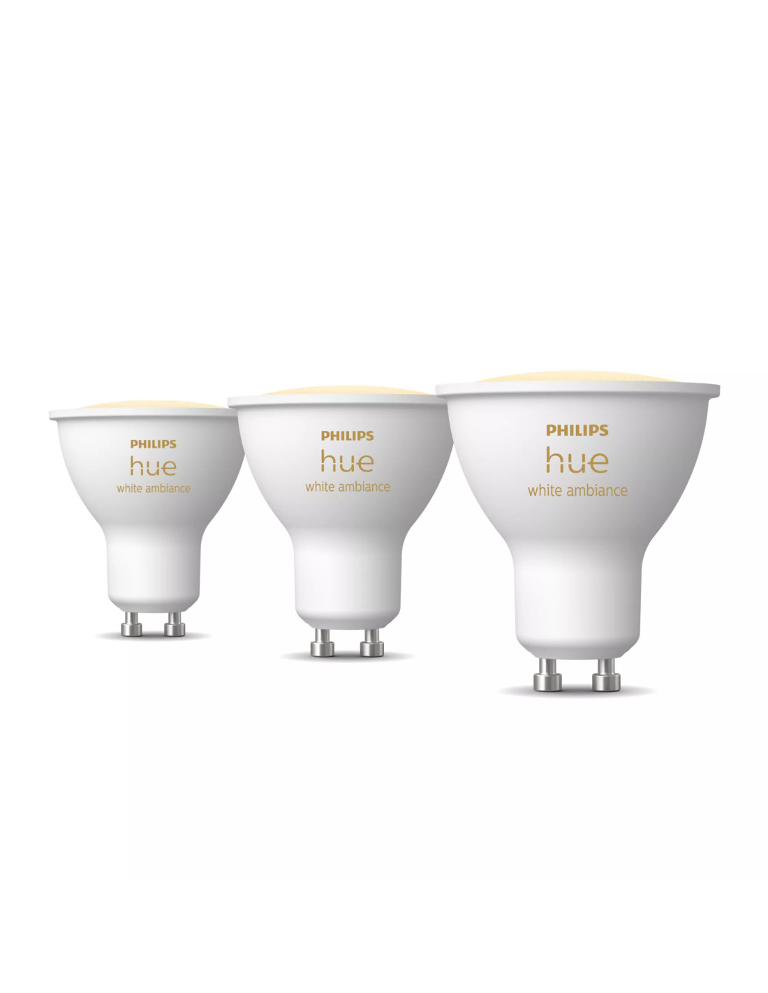 Philips Hue White ambiance GU10 - faretto connesso - (confezione da 3). Tipo: Lampadina intelligente, Interfaccia: Bluetooth/Zigbee, Colore del prodotto: Bianco. Sistema operativo mobile supportato: Android, iOS. Classe efficienza energetica: E, Consumi (modalità stand-by): 0,25 W, Consumo energetico (max): 4,2 W. Larghezza: 50 mm, Profondità: 50 mm, Altezza: 57 mm. Tipo di imballo: Scatola, Larghezza imballo: 72 mm, Profondità imballo: 72 mm