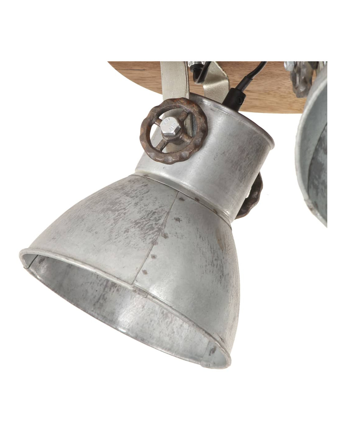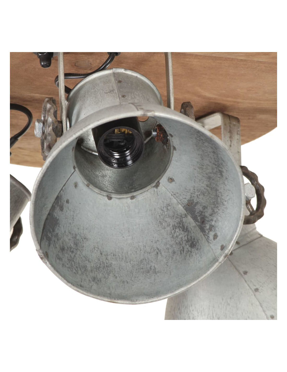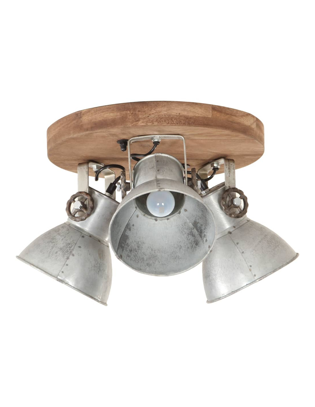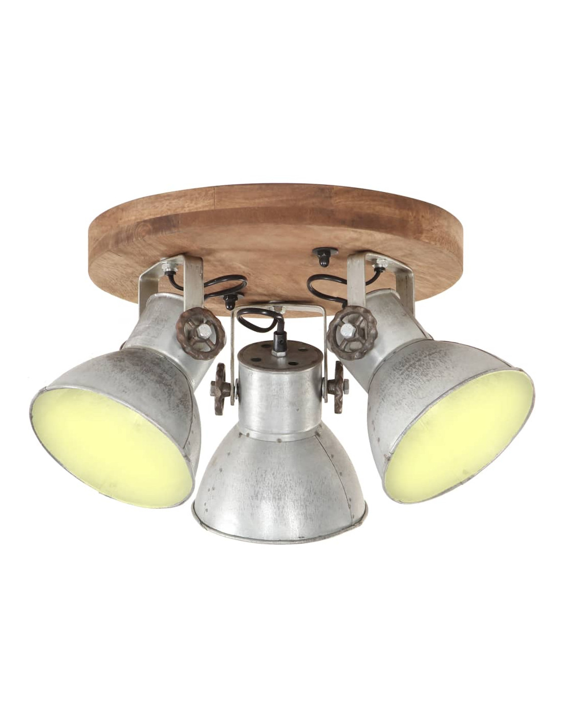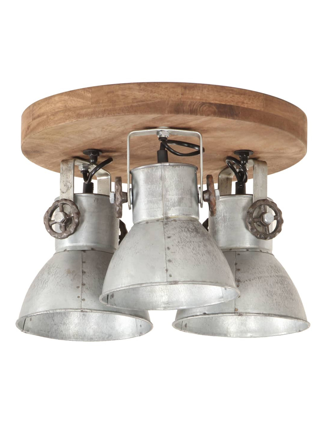 I paralumi in ferro, con finitura lota vintage e legno massello di mango con finitura marrone granaio esposto alle intemperie, si adatteranno perfettamente a interni rurali o industriali. La lampada da soffitto, con 3 paralumi, ha un attacco E27 per una lampadina di massimo 25 watt. Potete scegliere e installare lampadine E27 con vari colori della luce, creando un'atmosfera di relax e riposo.