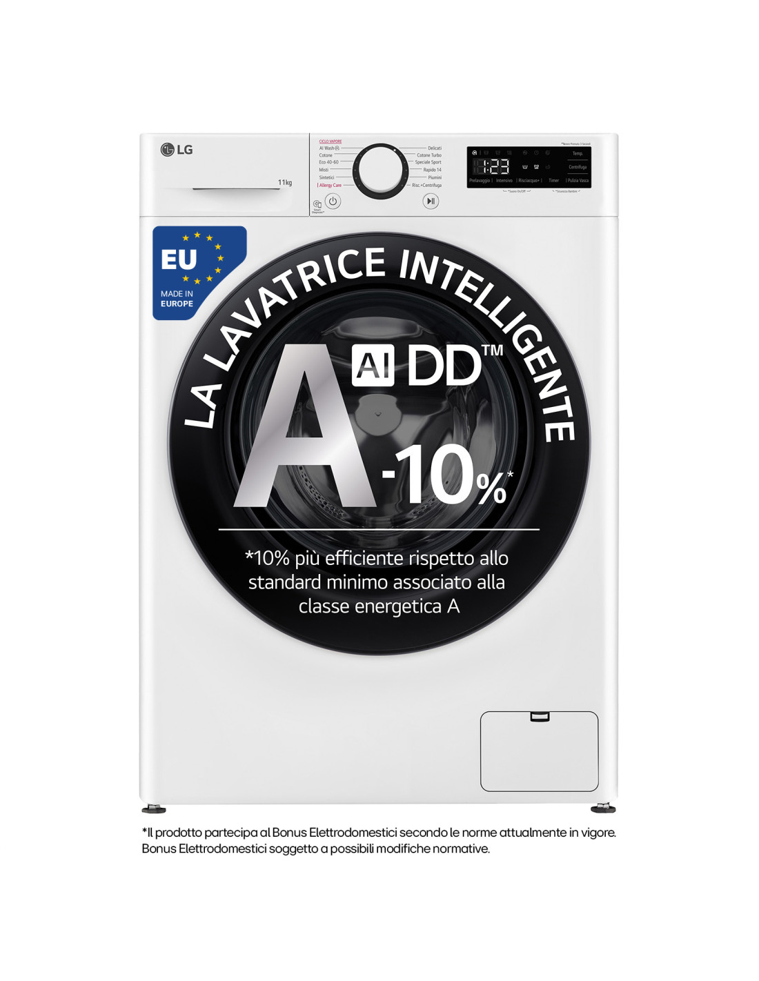 *Testato da Intertek a marzo 2019. Ciclo Cotone con 2 kg di biancheria intima confrontato con il ciclo Cotone tradizionale di LG (FC1450S2W). I risultati possono variare a seconda dei capi e dell’ambiente.