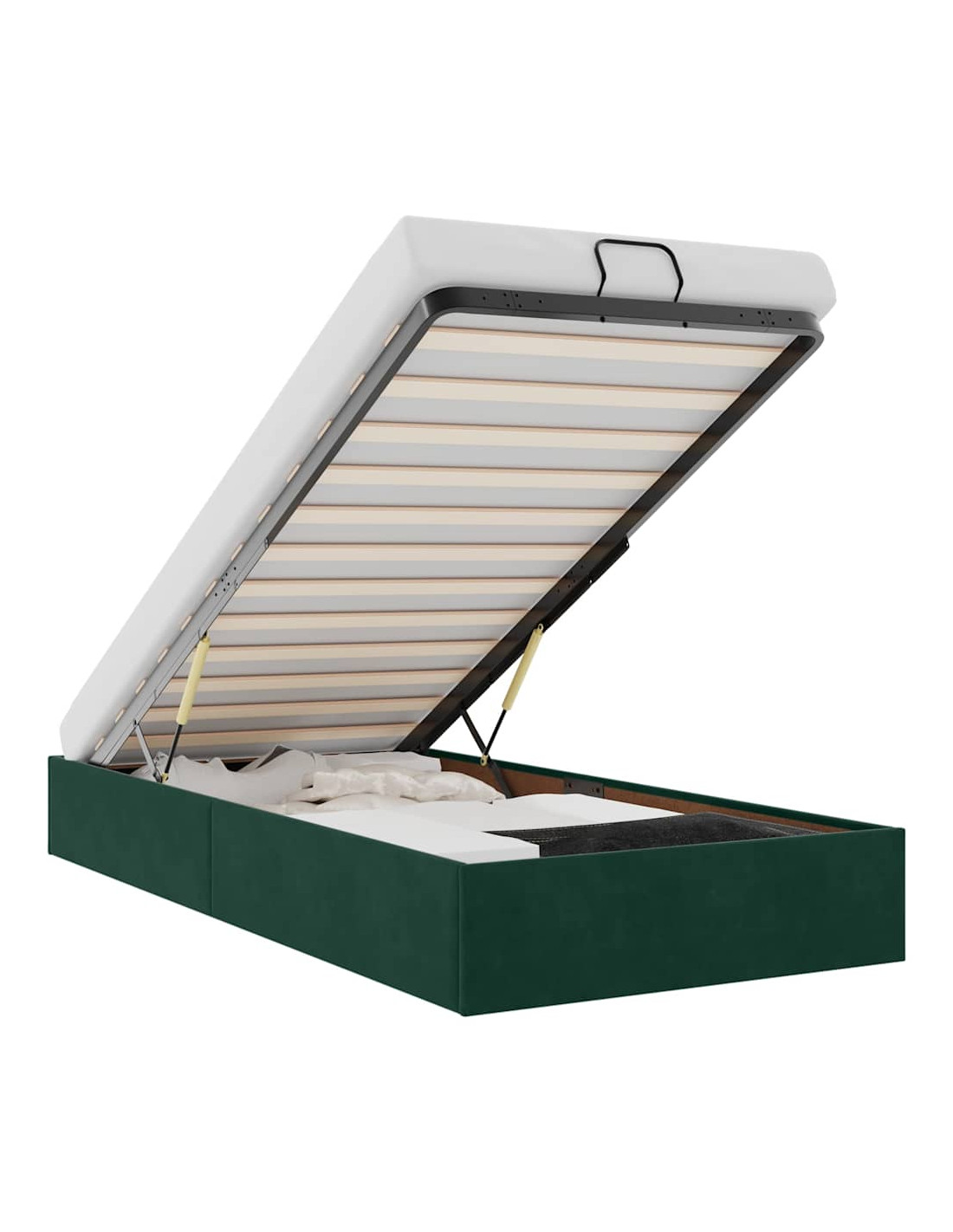 - Comodo meccanismo di sollevamento: Il meccanismo di sollevamento idraulico integrato consente un facile accesso agli effetti personali riposti sotto il letto. Con una semplice trazione della maniglia, la base a doghe si solleva dolcemente, permettendoti di recuperare i tuoi oggetti in modo rapido e senza sforzo.