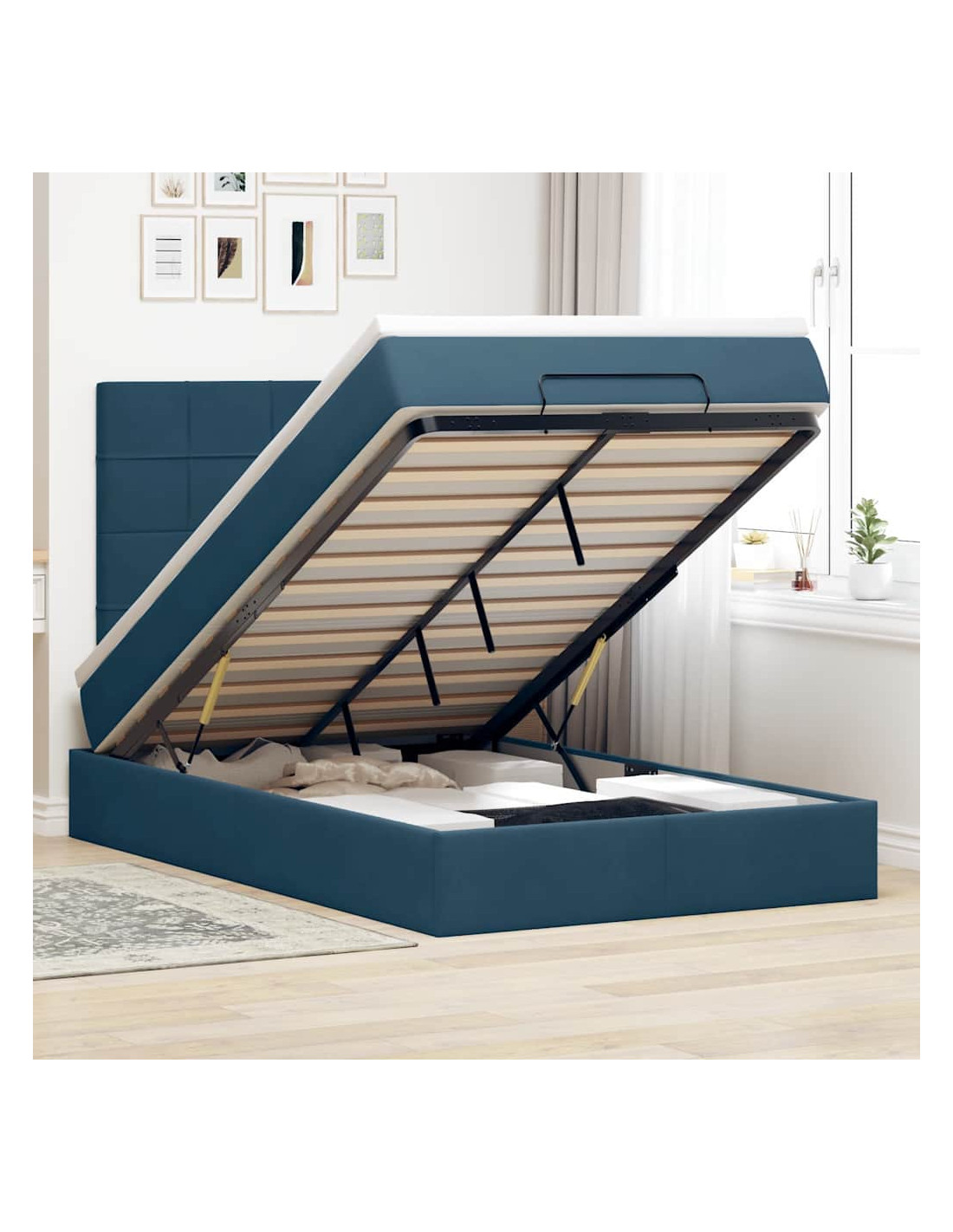 • Ampio vano portaoggetti sotto il letto: Grazie al meccanismo di sollevamento idraulico, il giroletto offre un ampio spazio sotto il letto, massimizzando lo spazio senza occupare ulteriore spazio sul pavimento. Con una semplice trazione della maniglia, la base a doghe si solleva dolcemente, permettendoti di recuperare i tuoi oggetti in modo rapido e senza sforzo.