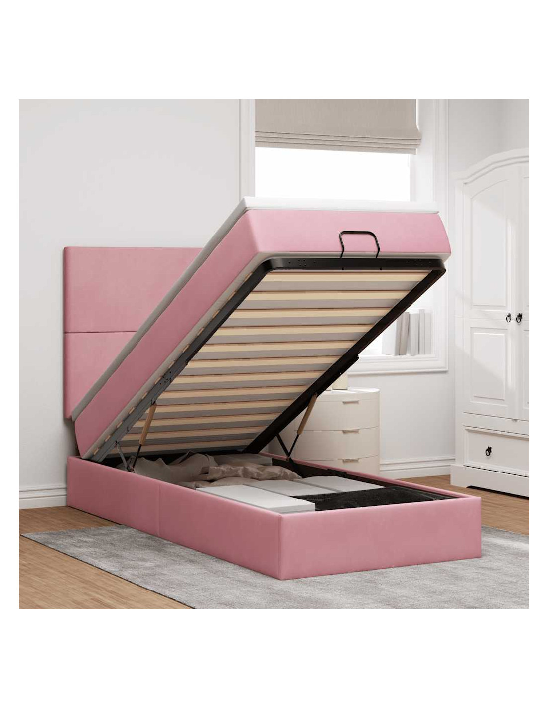 • Ampio vano portaoggetti sotto il letto: Grazie al meccanismo di sollevamento idraulico, il giroletto offre un ampio spazio sotto il letto, massimizzando lo spazio senza occupare ulteriore spazio sul pavimento. Con una semplice trazione della maniglia, la base a doghe si solleva dolcemente, permettendoti di recuperare i tuoi oggetti in modo rapido e senza sforzo.
